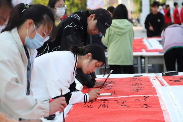 4月20日,南阳师范学院“百米书卷致百年”活动在逸夫楼广场开展,广场左右两侧火红的团旗、校旗飘扬,二百余名青年学子意气风发、挥毫泼墨、飘逸洒脱、书写芳华,将共青团百年来的风雨征程、峥嵘岁月凝聚笔尖,百幅行云流水、一气呵成的书法作品排列成“100”字样的阵型,为团的百岁生日献礼。这项活动还吸引了在校国际留学生参与其中。