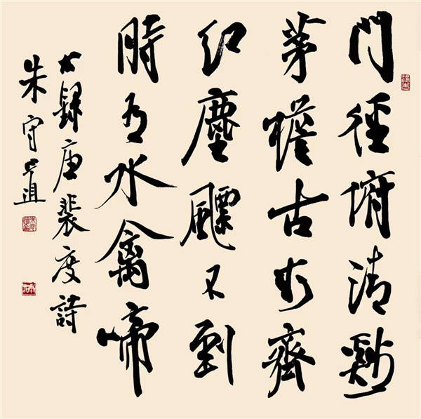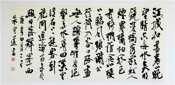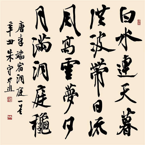 经过笔墨点墨的对立统一,审美的对立统一,然后,再回归和谐的中庸境界。客观地说,这种艺术追求与思想历程,某种程度上讲,其实,就是向上一路,千圣不传的中国书法境界,也是佛之所谓哲学境界。我观朱兄守道的书法艺术,就如同朱兄之名讳,守道大同乃中庸,有大儒之风尚,秉浩然之正气,沁人之心脾,焕然浩荡之中国精神