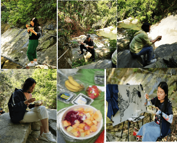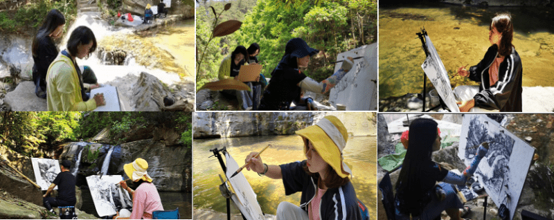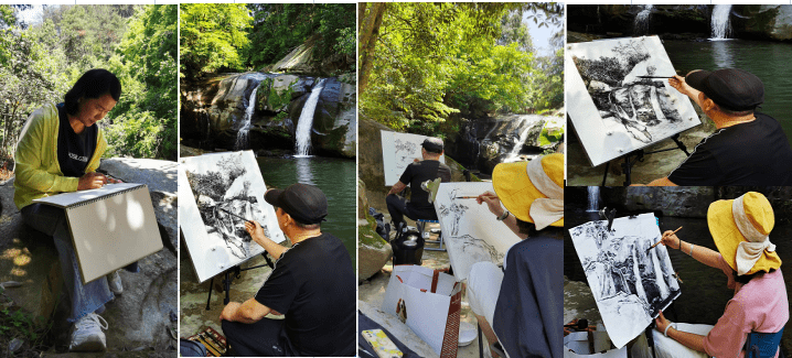 深入生活、走进大自然去呼吸新鲜空气,以静观众景,以达到外师造化,中得心源的境地。到达目的地后,大家游走山林间踩点寻找创作处。