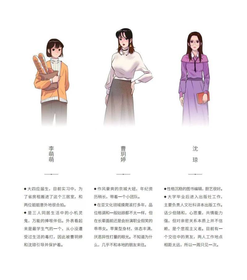 不同的社会背景与原生家庭背景决定着三位女主人公将呈现截然不同的性格:大四应届毕业生李萌萌为了省房租搬进三人合租屋,她是生活中的小机灵鬼,没有复杂的人生经历,也没有遭遇过什么挫折;曹玥婷是作风豪爽的京城大妞,在三人中年纪资历稍长,于京城亚文化领域摸爬滚打多年,品位和格调与一般姑娘不尽相同;沈琼是性格沉稳的图书编辑,话少但是随和,心思较重,与男友由于工作地点相距较远,一周只能见一次,内心对亲密关系并不信赖。