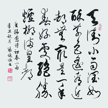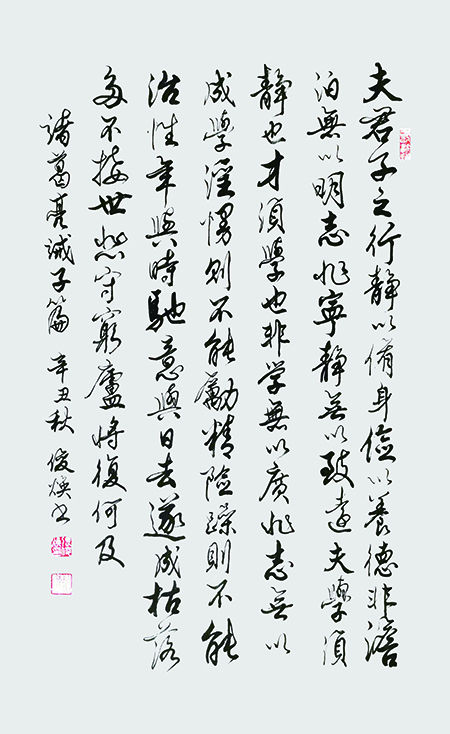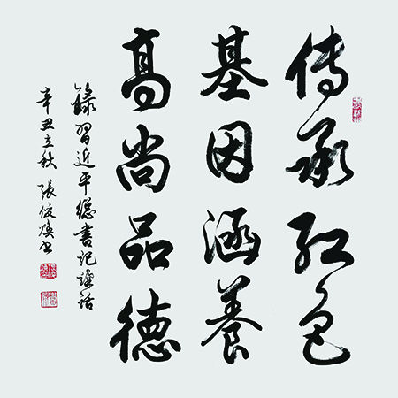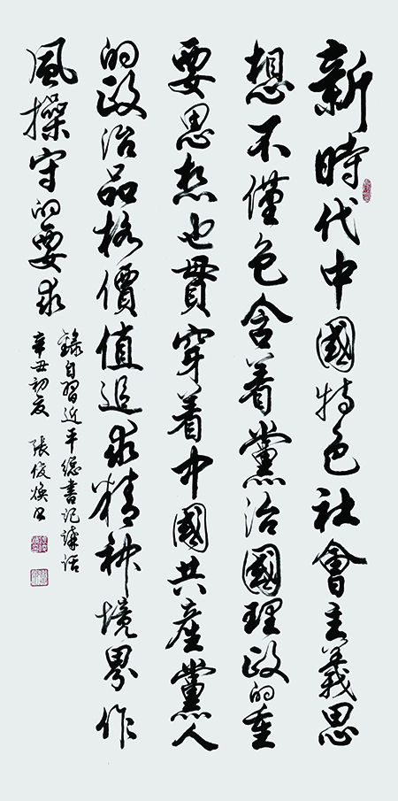 张俊焕从小爱好书法,数十年来坚持临摹练习,从传统书法入手,初学颜、柳体,兼修隶书,后崇王羲之行草书。其倾心研修书法,以继承和发扬传统书法为目的。由于长期坚持,习书已成为日常必不可少的重要内容。他博采众长,锲而不舍,黾勉创新,自成一家。他的书法字如其人,正气凛然,严守法度,中规中矩,平和淡雅,笔法精到,线条遒劲有力,结字丰满圆润,温柔敦厚,儒雅沉静,沉稳中不失灵动,飘逸中隐含雄强。布局讲究,平稳流畅,疏密有致,内涵深邃。作品给人以高雅、清新、耐看、朝气蓬勃、赏心悦目之感。著名美术评论家邵大箴先生称其作品“古奥清奇,醇厚率逸”。