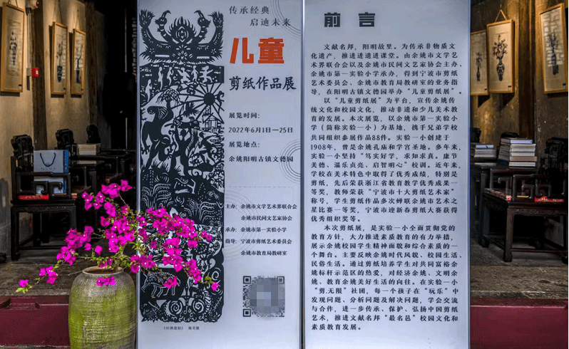 本次展览围绕"艺心向党,讲余姚最名邑故事"这一主题,以中国剪纸这一珍贵的世界非物质文化遗产为切入点。通过剪纸创作,弘扬爱国主义精神,弘扬伟大的战疫精神,讴歌共同富裕新余姚,激发儿童的历史责任感,引导儿童树立正确的历史观、文化观,提高儿童的审美和文化素质,促进校园美术教育事业的发展。在开展仪式活动中,来自余姚市文艺界、教育界、民间艺术界和校园剪纸师生代表、家长代表、古镇游客150多人参与了余姚儿童剪纸展颁奖活动。