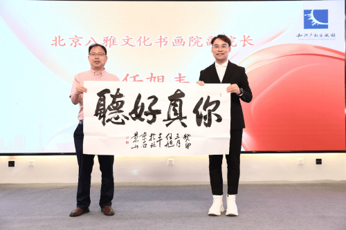 北京八雅文化书画院副院长任旭丰先生向张涛先生赠送书法作品:你真好听,张涛上台接受馈赠,并合影留念。