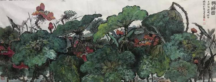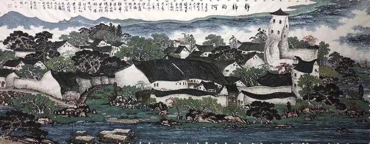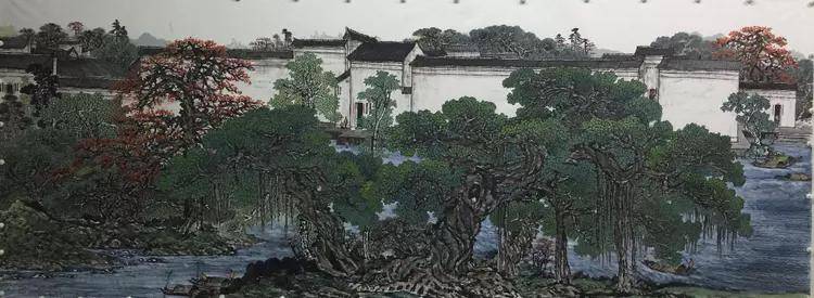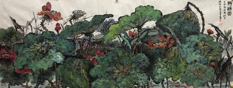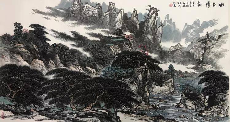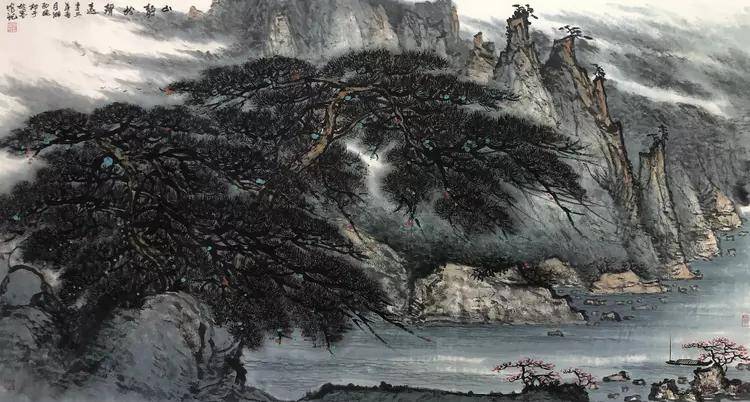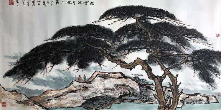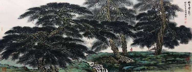 他创作的重彩松墨长卷,有着深沉、雄健、老辣、向上飞扬的传统功力,运用精彩绝伦的圆润中锋、有力侧锋,以一遍复一遍的添彩筑墨,在当代艺术画坛树立起了一座高高的山峰。