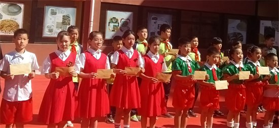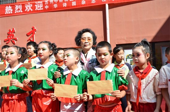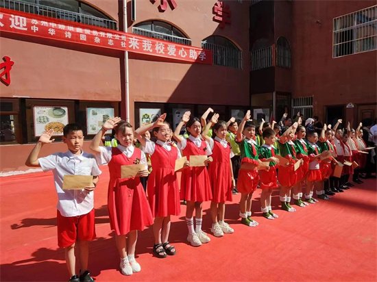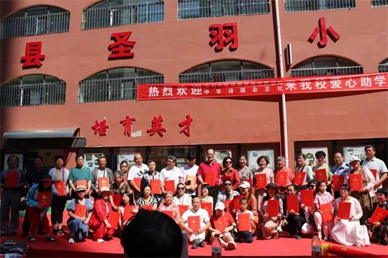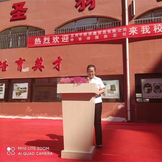 在这里,我代表延川圣羽小学的全体师生衷心地感谢苏州中娇琪鑫贸易有限公司的全体员工为我校36名贫困学生捐助28800元,感谢《中华诗园》采风团53名诗人、老师、朗诵家为我校捐款23420元。