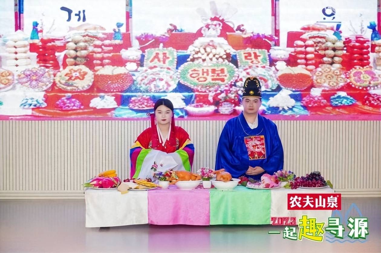 大家欢聚一堂,以农夫山泉对饮,欣赏朝鲜族歌舞表演,体验朝鲜族婚礼仪式。(更换一些拿农夫山泉的照片)