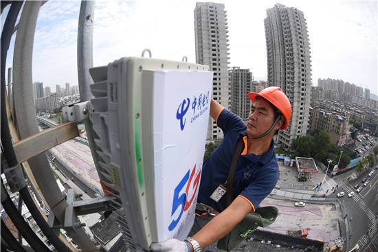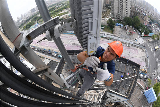 连日来,中国电信淮安分公司无线维护中心组织5G维护优化人员加班加点对5G站点开展设备巡检和精细优化,着力强化5G覆盖效果,提升客户服务感知。图为9月17日,淮安分公司5G维护优化人员在清隆桥四角塔基站施工的场景。