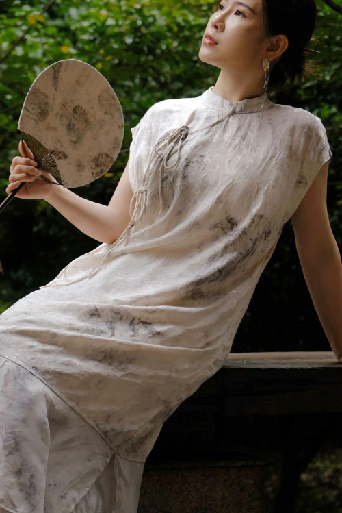 染野植物染成立于2019年,主理人顾婷为非遗传统旗袍手工制作工艺传承人、植物染工艺传承人。初心为还原生命本来的色彩,用布料定格大自然的色彩,感悟泥土树木花叶果实,风雨雷电阳光空气与布料的共同画作,自然天成。