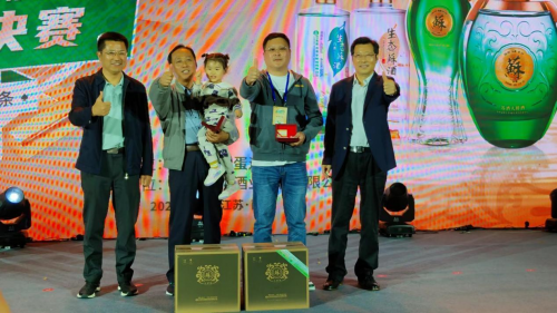江苏双沟酒业销售有限公司南京事业部总经理熊凤雷、江苏大势网络科技有限公司华东大区总经理冯郁,为获得“双沟杯”江苏省第四届网络全民健身运动会掼蛋大赛鼓励奖的50名运动员代表颁奖