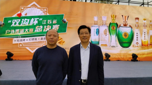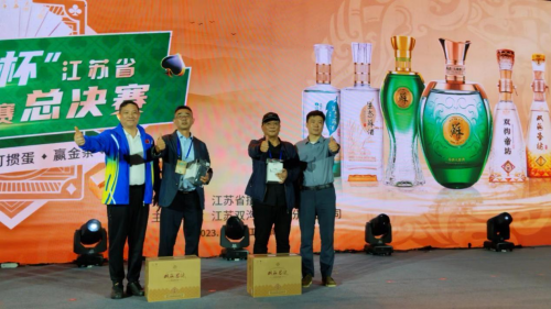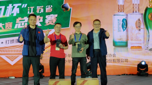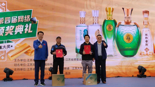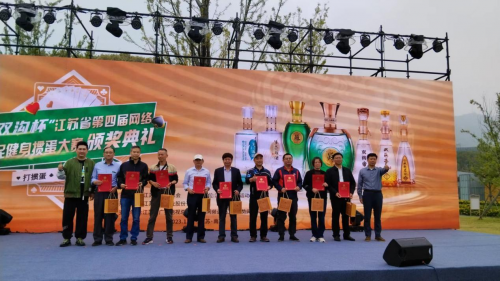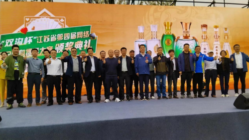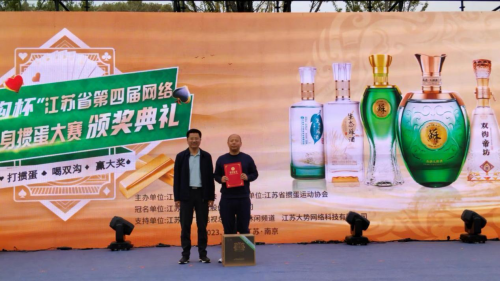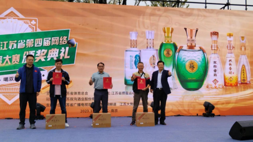 漆冠山会长和洋河股份总裁助理、双沟酒业销售有限公司党总支书记、总经理范晓路为获得“双沟杯”江苏省第四届网络全民健身运动会掼蛋大赛三等奖的运动员颁奖