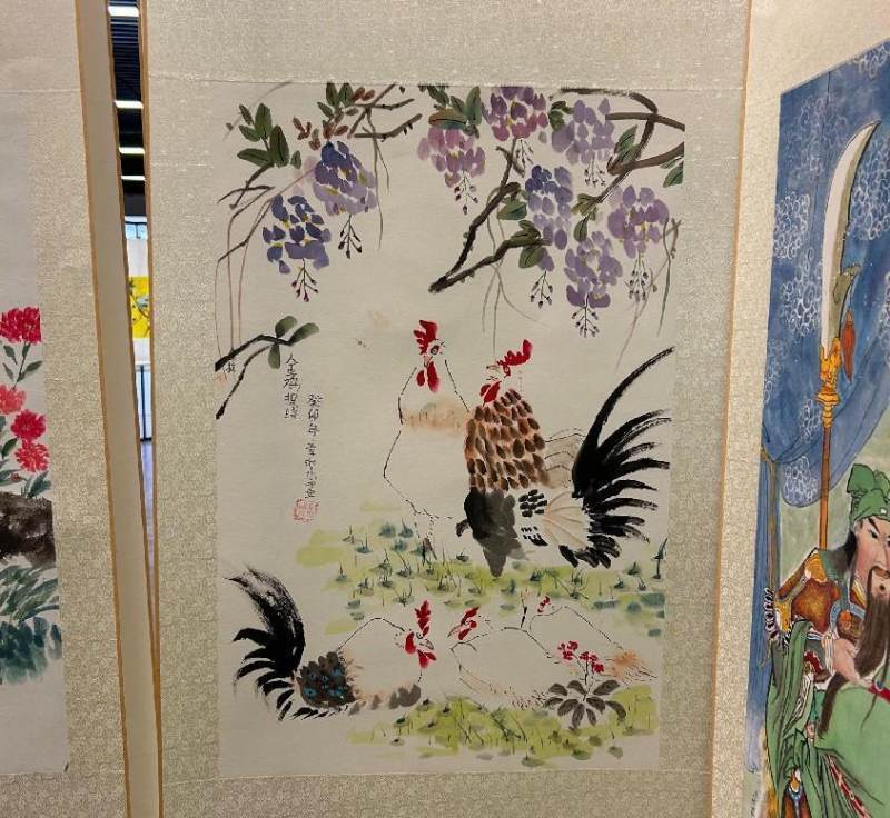由上海西外外国语学校 六(11)班 章赵乐(Leanna Zhang)同学画的国画《金鸡报晓》尤为突出。她运用十字定位法构图。然后注重定位公鸡的头部,鸡冠,嘴巴,眼睛的细节刻画和腿部大概的位置定型,再从鸡头-脖颈-胸部-腿部-脚掌的顺序逐一绘画,而且绘画步骤井然有序。公鸡的身体运用浓墨和淡墨相结合,用笔触去表现公鸡身体的体积感,而且绘画中水分的控制也是比较出色的。用曙红或者用大红来加强绘画鸡冠,使得整幅绘画作品看上去栩栩如生,简洁又明了。这样的绘画功底离不开她的国画启蒙李向东老师的谆谆教导与她自幼刻苦学习中国画是密不可分。