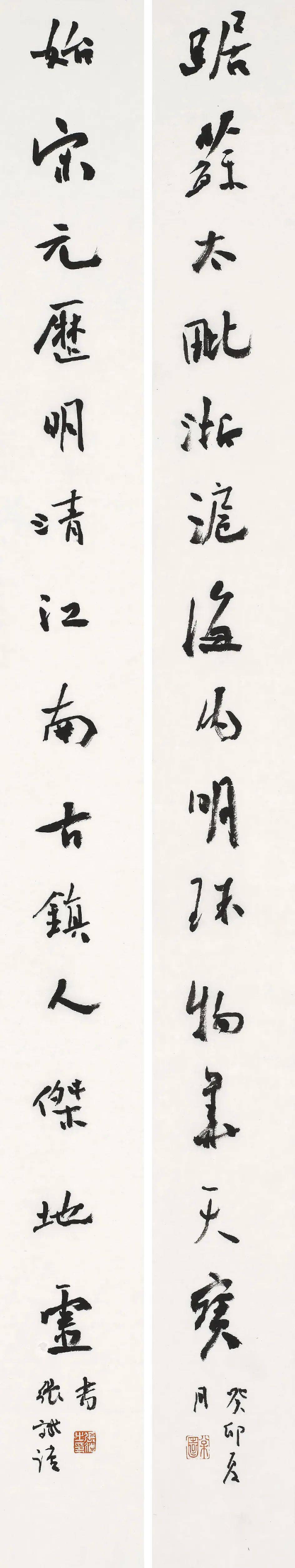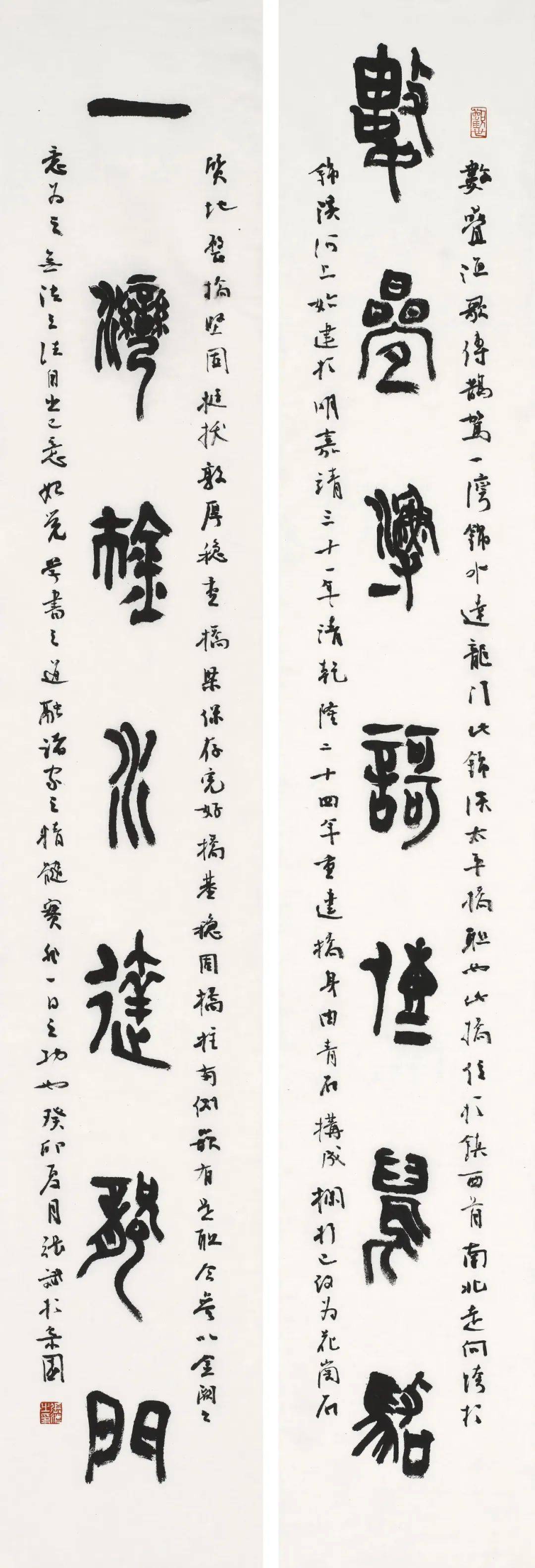 款识:此锦溪太平桥联也。此桥位于镇西首,南北走向,跨于锦溪河上。始建于明嘉靖三十一年,清乾隆二十四年重建桥身,由青石构成,栏杆已改为花岗石质地。整桥坚固挺拔敦厚稳重,桥梁保存完好,桥基稳固。桥柱两侧嵌有是联,今参以金阙之意为之。无法之法,自出己意。始觉学书之道,融诸家之精髓,实非一日之功也。癸卯夏月张斌于松园。