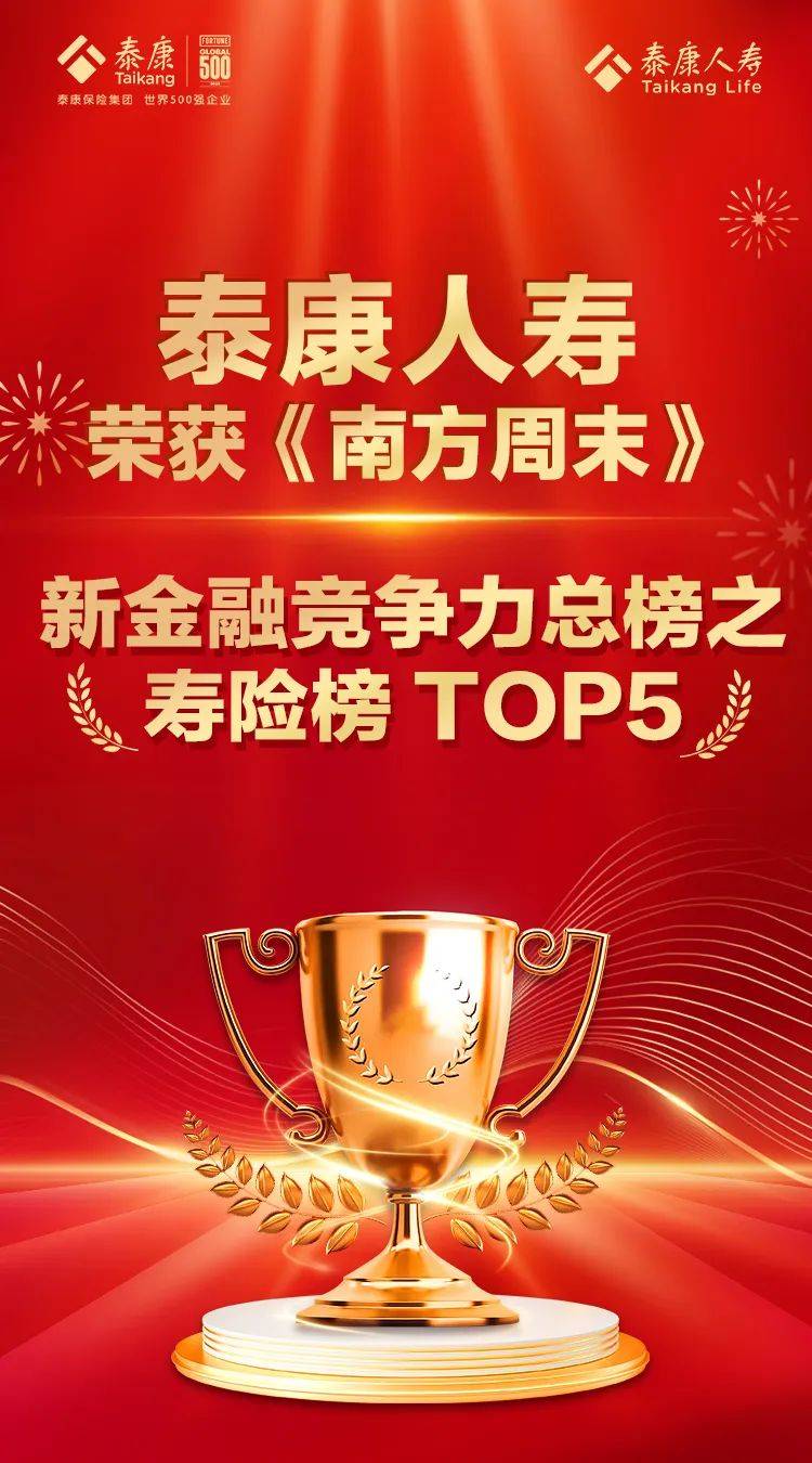同时,在《南方周末》推出的中国新金融竞争力排行榜中,泰康人寿荣获“中国新金融竞争力总榜之寿险榜TOP5”。