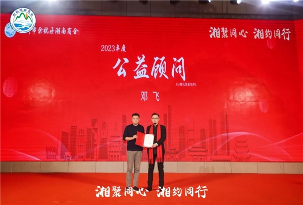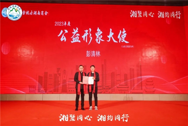 迎新晚会上,商会会长彭中云做了热情洋溢的欢迎致辞,余杭工商联副主席蒋旭东、湖南省工商联商会处处长张帆、中国民营经济研究所所长张文平等先后发表致辞。 商会对新一年度秘书处成员颁发聘书和对新晋升理事会成员授牌,对年度优秀成员进行表彰颁奖。聘任中国免费午餐第一人邓飞为商会公益顾问, 聘任浙江省人民政府一等功获得者“平民英雄”彭清林为商会公益形象大使。