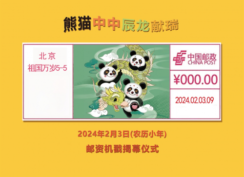 2024年2月3日,在南方小年到来之际,中国邮政携手中国文学艺术基金会熊猫艺术发展基金、《集邮》杂志社,和江门市台山市南洋归侨文化博物馆,在京、江两地同时发布、启用“熊猫中中辰龙献瑞”明信片及邮资机戳,为全国集邮爱好者营造了龙年新春佳节的喜庆氛围。