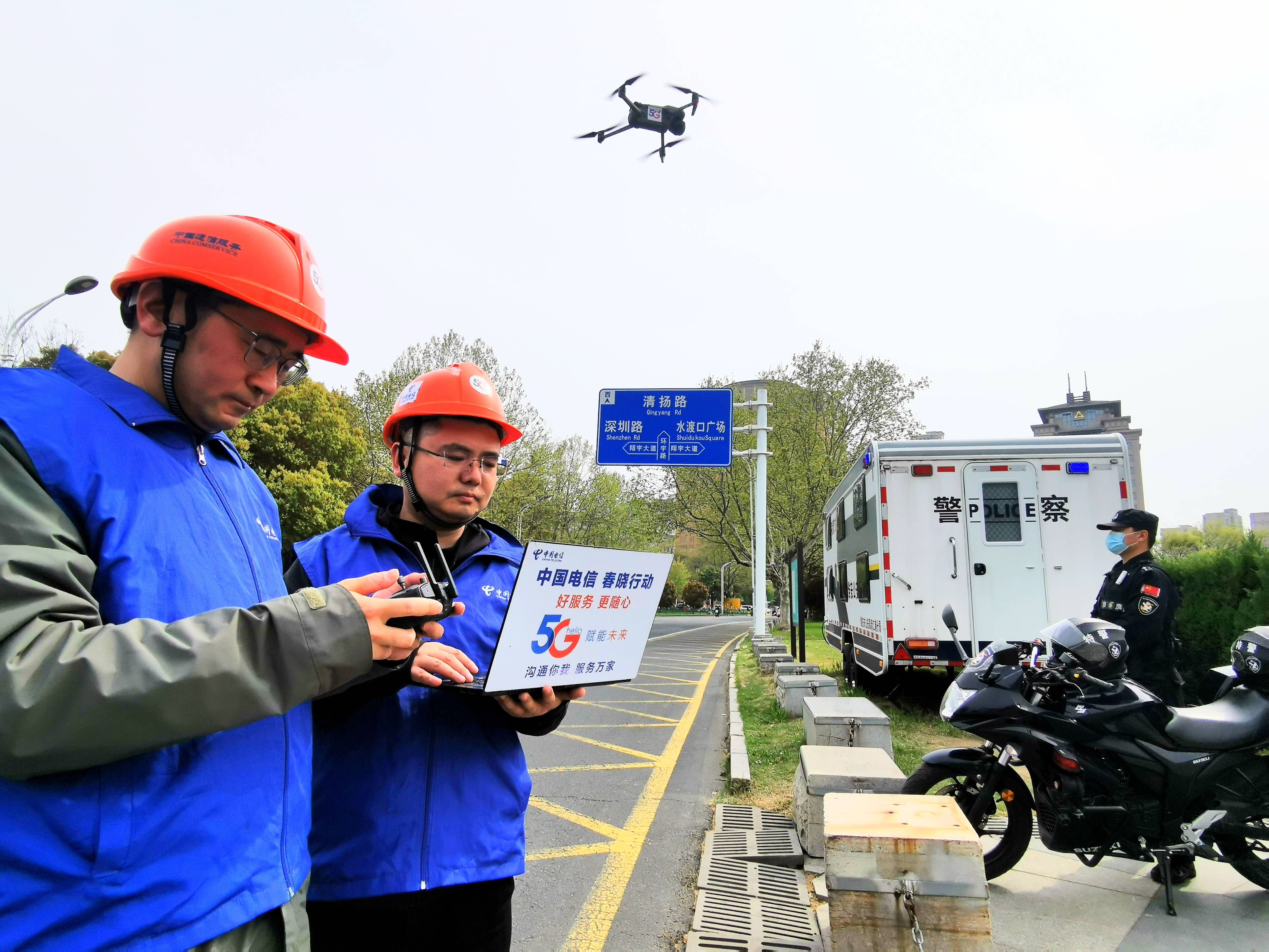 中国电信淮安分公司积极探索低空5G覆盖场景,建立地空一体化的5G无人机全覆盖网络,有效拓展“5G+无人机”应用场景,包括景区人流量监控、河道巡检等。图为4近日,淮安分公司工作人员操作5G+无人机协助景区开展客流分析。