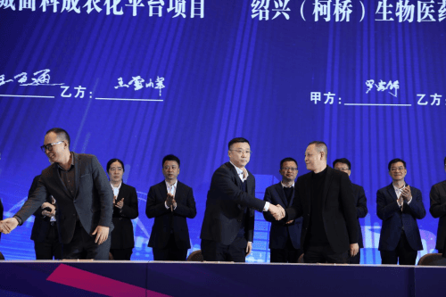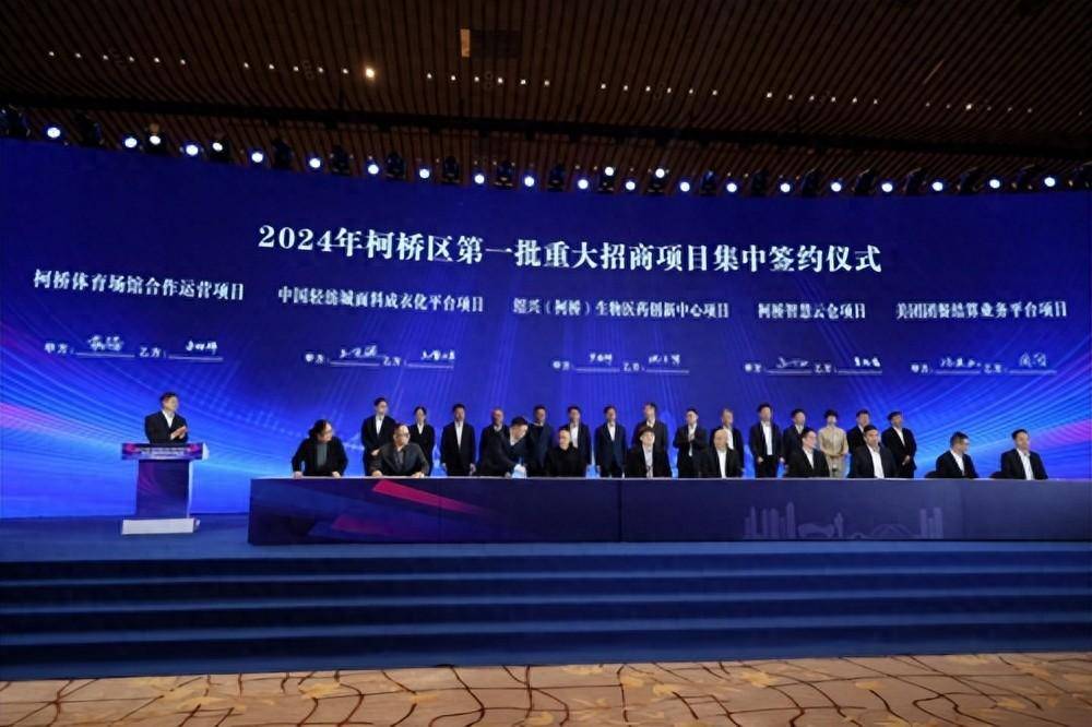 2024年2月29日上午,2024年绍兴市柯桥区优化营商环境大会暨第一批重大招商项目集中签约仪式在鉴湖大酒店会议中心举办,本次集中签约项目共32个,计划总投资702.37亿元。其中百亿元以上项目2个、50亿元项目1个、10-50亿元项目10个、1亿美元以上重大外资产业项目2个。中国轻纺城面料成衣化平台借助深圳服装原创力优势,组建集中央板房、成衣制作、直播电商于一体的产业生态,在柯桥建立面向直播电商的大型选品中心,轻纺城集团总经理王百通和深圳南油版酷王雪峰进行了现场签约。