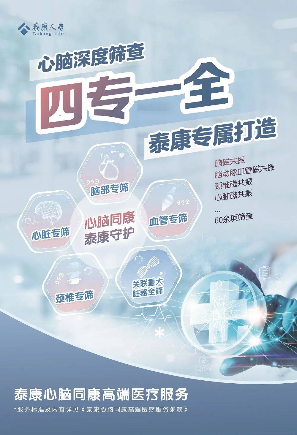 秉承着“预防大于治疗”的理念,泰康深度整合大健康生态资源,匠心打造了“心脑同康”高品质医疗服务,以深度心脑联合筛查为特色,为客户专属提供从诊前筛查、诊中就医、诊后康复的全流程心脑守护方案。