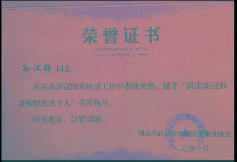 ·2020年10月,获“抗击新冠肺炎疫情先进个人”称号;