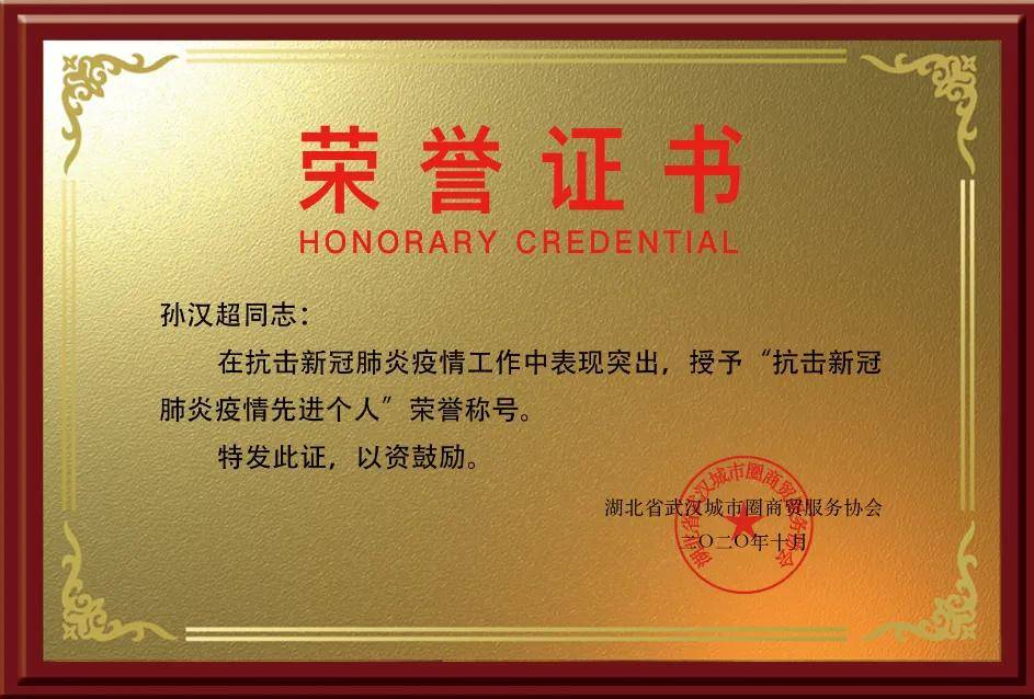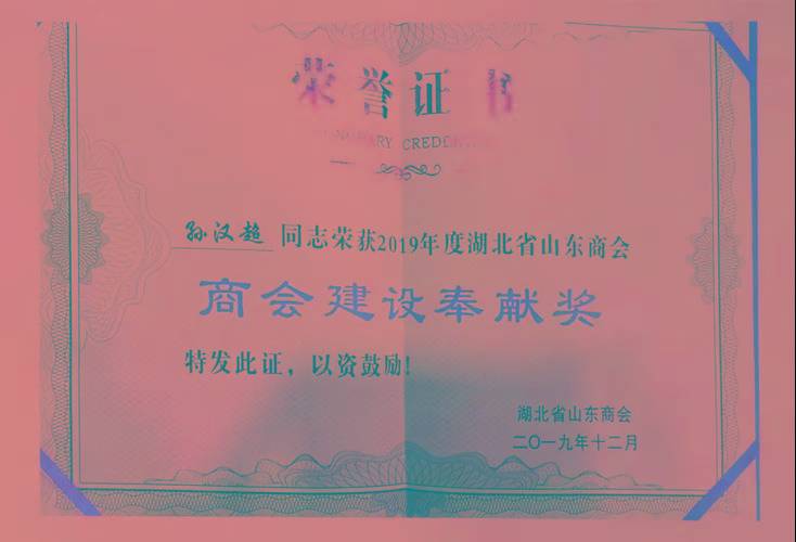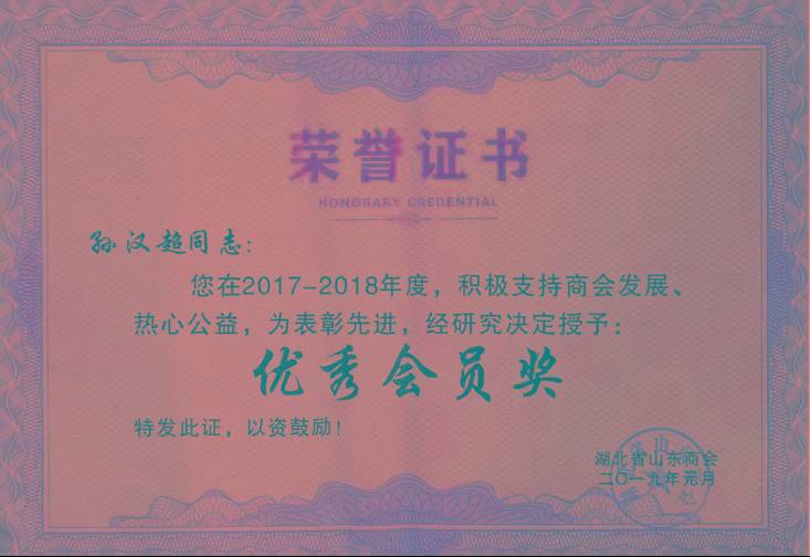 ·2019年1月,获武汉山东商会“优秀会员奖”;