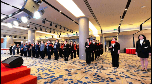 随后,全体员工齐声合唱《我爱你,中国》,歌声嘹亮,饱含深情,传递出对祖国母亲的诚挚敬意与美好祝愿,将活动的氛围推向了高潮。