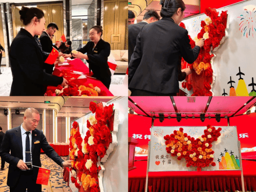 活动伊始,酒店为每位员工精心准备了一朵小红花和一面小红旗。在激昂的背景音乐中,员工们手持小红旗,依次走向祖国的地图,庄重地将小红花插在上面,每一朵小红花都代表着员工们对祖国深深的热爱与祝福。