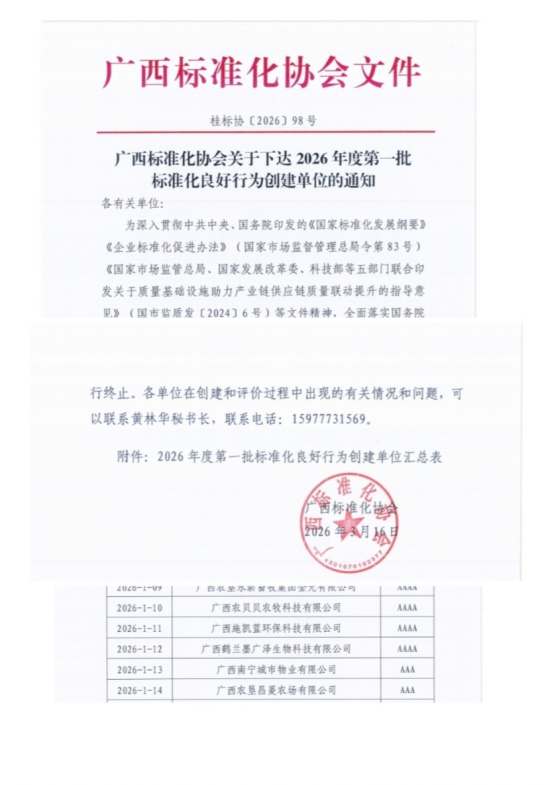 近日,广西标准化协会正式公布2026年度第一批标准化良好行为创建单位名单,广西鹤兰墨广泽生物科技有限公司凭借全产业链标准化建设的扎实功底、皮肤微生态健康管理领域的突出成果,成功获评标准化良好行为AAAA级创建单位,成为广西本土生物科技与美妆健康领域的标杆示范,这份国家级权威认可,不仅是对企业标准化工作的高度肯定,更彰显了其引领行业规范化发展的硬核实力。