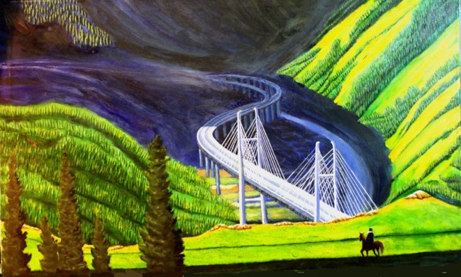丝路行,60cm×100cm,2018年3月,心同丝路与尘远,桥似诗笺出幽涧。