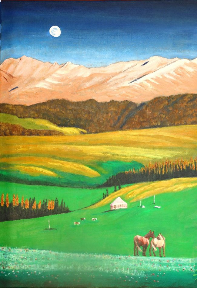 入梦乡,70cm×50cm,2025年9月,白昼喜逢盈凸月,草原静好入梦乡。