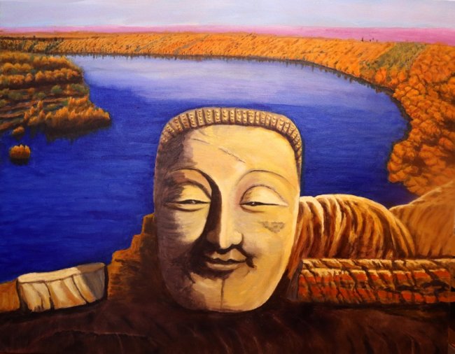 米兰释语,80cm×100cm,2021年6月,米兰考古现佛首,心云未开河长流。