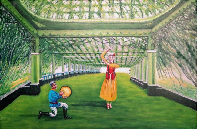 醉美家园,60cm×90cm,2022年12月,浓荫靓影舞蹁跹,丰收足蹈诗兴酣。