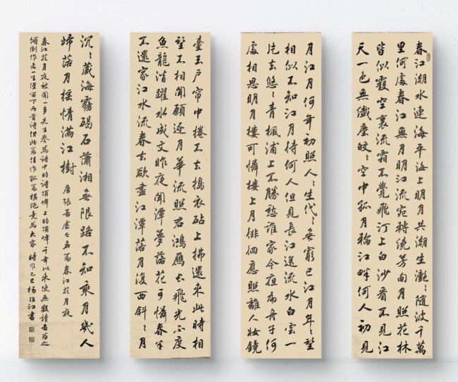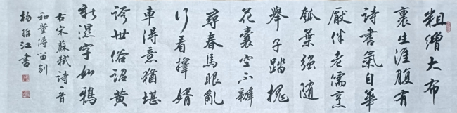 从书法本体的艺术内核观之,杨哲江的行楷创作,最动人之处在于实现了 “法度” 与 “意趣” 的完美平衡,打破了 “工则易板,放则易乱” 的行楷创作困境。其用笔恪守中锋立骨的书道准则,遒劲凝练而不凌厉刚猛,流畅沉稳而不滞重刻板,起收干净利落,使转圆融通达,线条刚柔相济、绵里藏针,重处力透纸背而不臃肿,轻处纤毫毕现而不浮弱,于方寸之间尽显对毛笔锋毫的极致掌控。结体上,他秉持 “端庄杂流丽,刚健含婀娜” 的传统审美圭臬,结字端庄严谨、平正中见奇险,通过笔画的俯仰向背、字势的开合收放,在规范的框架内营造出自然灵动的变化,欹正相生,疏密得当,毫无刻意造作之态。通篇章法排布气韵贯通,字距行距呼吸有度,墨色浓淡干湿随文辞意境自然流转,通篇观之,温润儒雅,清气满纸,浓厚的文人书卷气扑面而来,彻底褪去了浮躁炫技的江湖习气,尽显传统文人书法的清雅格调。