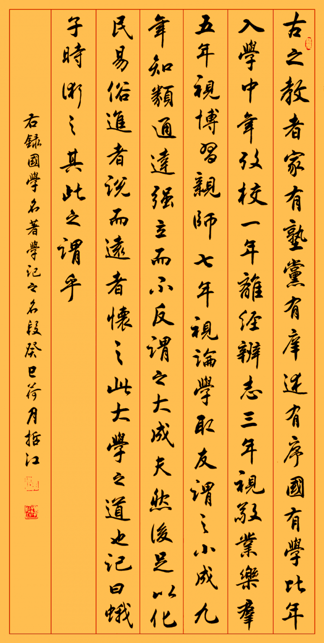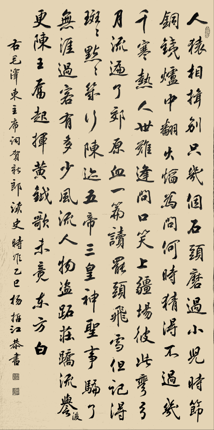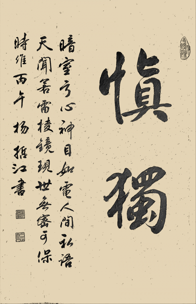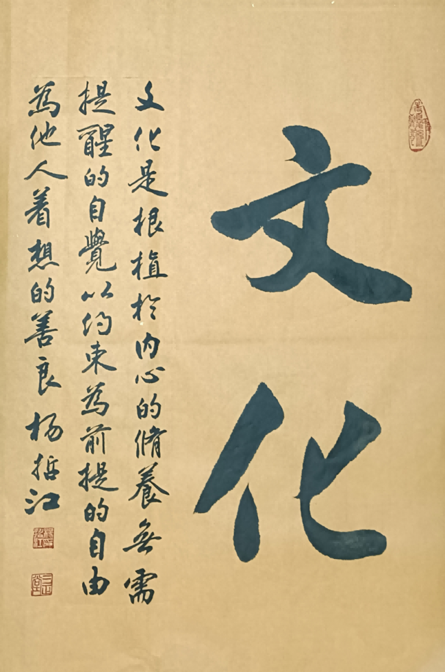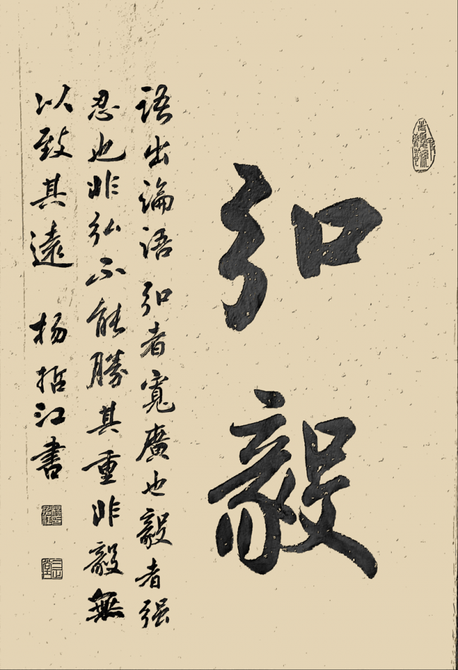 尤为难得的是,杨哲江始终坚守 “书为心画,文以载道” 的文人书道核心,拒绝将书法沦为单纯的技法表演。数十年深耕教育领域的人生积淀,让他的笔墨里,不止有纯熟的技法,更有深厚的学识修养与通透的人生感悟。他常以自作题跋入书,文辞清雅,意蕴悠长,让笔墨的节奏起伏与文辞的气韵意境同频共振,真正实现了诗书相融、文墨一体,让作品不止于视觉层面的审美表达,更成为精神内核与文心修养的载体。作为深耕教育管理与美育普及数十年的践行者,他始终以 “修己达人” 为初心,不仅在硬笔书法的规范化、大众化发展领域躬身深耕,推动硬笔书法艺术走进大众、走进校园,更以持续数十年的创作与研究,为书法艺术的传承发展筑牢根基:从个人书法作品集的付梓,到与沈鹏、李铎、张海等书坛泰斗合著艺术典籍,再到主编《中国书法大字典》为后学提供系统的研习范本,他始终以创作者与传承者的双重身份,为中华书法文脉的薪火相传持续发力。