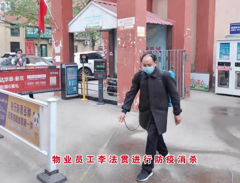 小区物业员工李法贯,年岁已高,但干劲不减。李法贯负责小区16栋楼房楼道、小区路面、公共卫生间、垃圾桶的消毒消杀工作。每天他都早早起床,背起重达20多公斤重的喷雾气,一遍又一遍的对整个小区进行消毒,做到不留死角,不留空档,有效保障了小区环境安全,被业主们亲切地称为“最帅消毒大爷”。