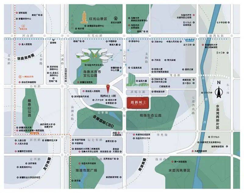 项目近享红光山景区、乌鲁木齐市文化公园、南侧大型生态体育公园、南湖广场等8大生态公园;会展吾悦广场(在建)、南湖创造、希尔顿酒店等多个综合商业体,创造缤纷生活体验;益民大厦、奥体中心、六馆一心、会展中心等4座城市级配套,持续引领城市人文价值。