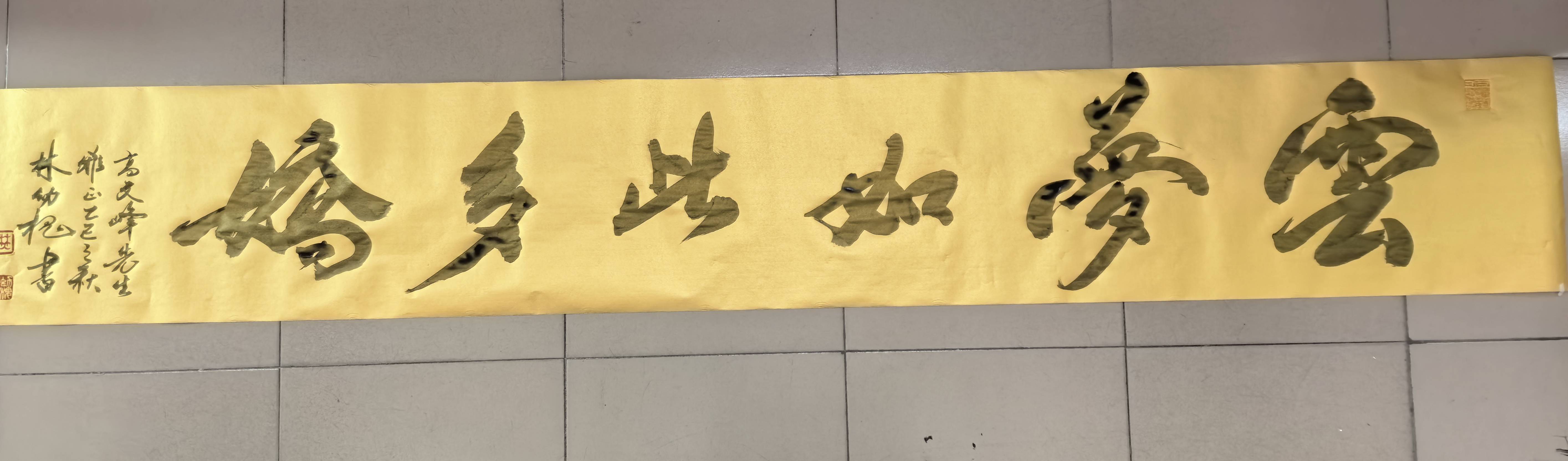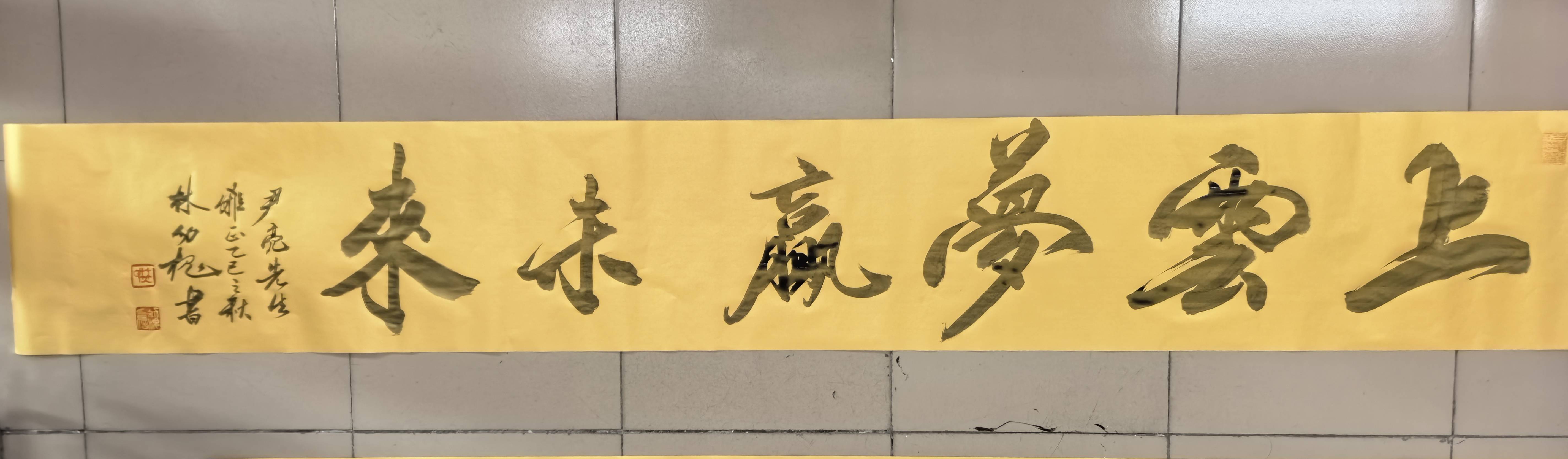 林幼槐先生挥毫时,笔锋刚劲有力,“上云梦赢未来”“追梦前行”“精气神”等字样跃然纸上。这些字句仿佛是云梦电信人内心的呐喊,凝练着他们对事业的执着追求和积极向上的精神风貌。每一笔、每一划,都饱含着对云梦电信未来的美好期许。