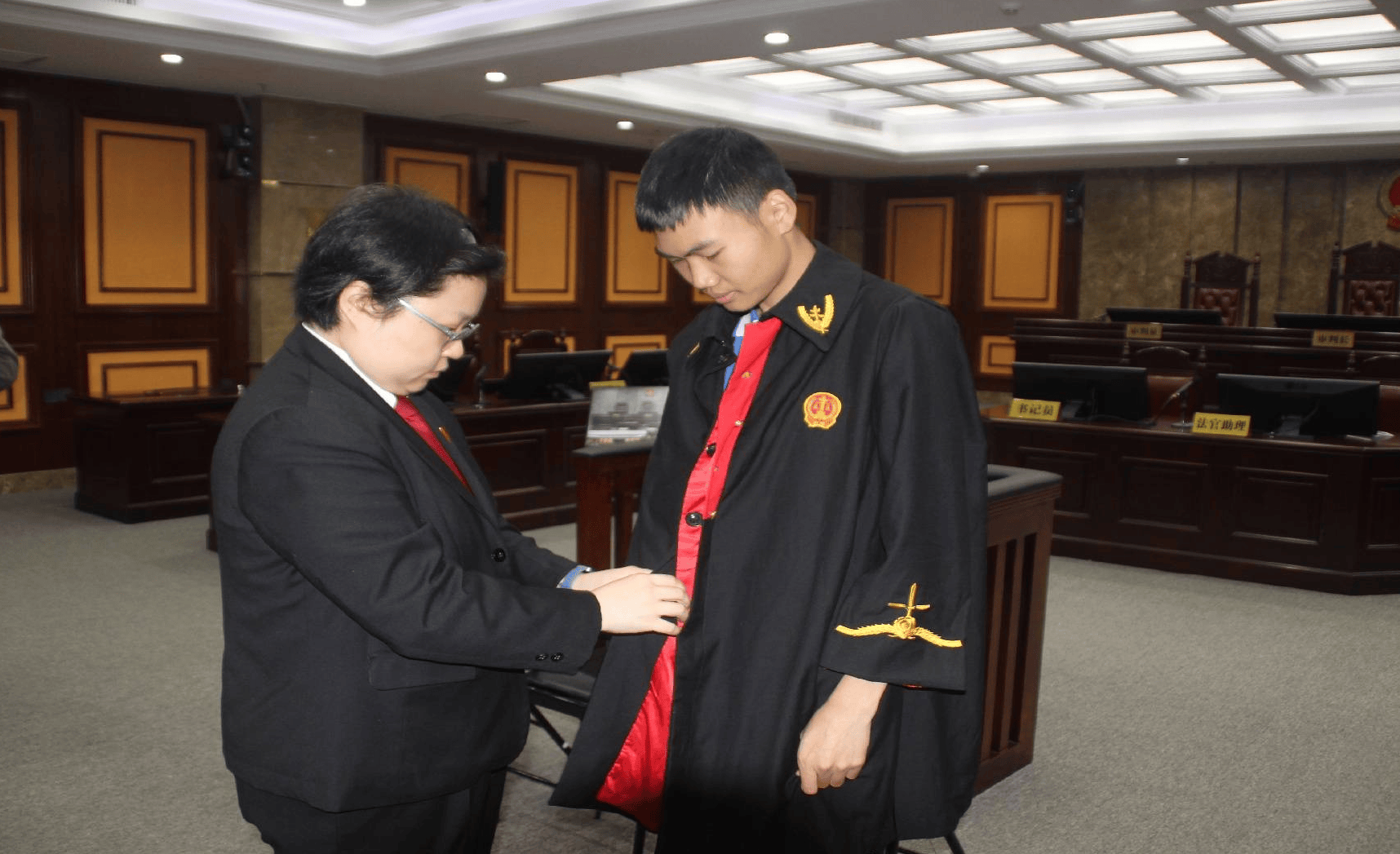 最引人入胜的环节莫过于“角色初体验”。同学们在了解了法袍、法徽所象征的公正与权威后,怀着敬畏之心,有序试穿法袍,坐上审判席,亲身感受法官审理案件时所肩负的责任。通过触摸、穿戴和模拟体验,书本上的法律条文转化为可感可知的实践,程序正义与司法权威的理念悄然浸润心田。