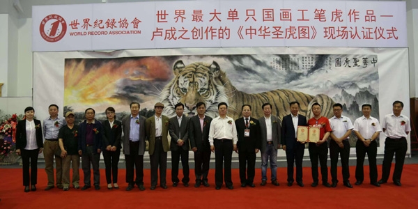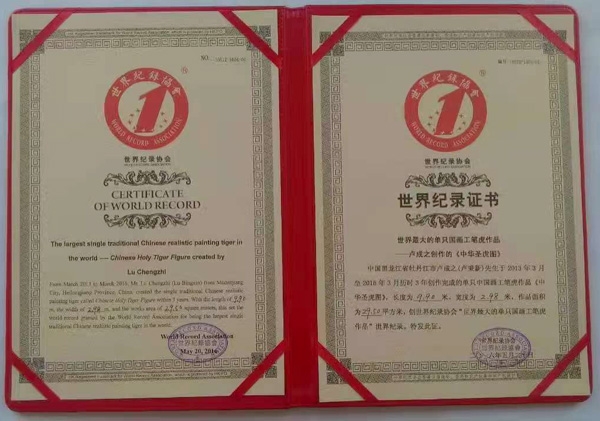 卢成之创作的《中华圣虎图》,由中华民间藏品鉴定委员会、央视鉴宝专家蔡国声亲临命名、题跋,申请《世界纪录》。2016年5月20日,世界纪录认证官中方代表张健,在牡丹江大学体育馆主持举行现场认证仪式,经过世界纪录协会严格审评、数据分析比较及现场正式检测、拍照,成功认证为《世界最大单只国画工笔虎》。同年又被“上海大世界基尼斯总部认证为《中国最大单幅走兽工笔画》,成为世界之最,他的巅峰之作。