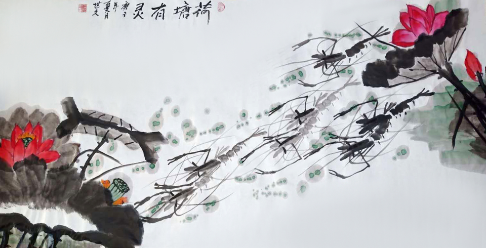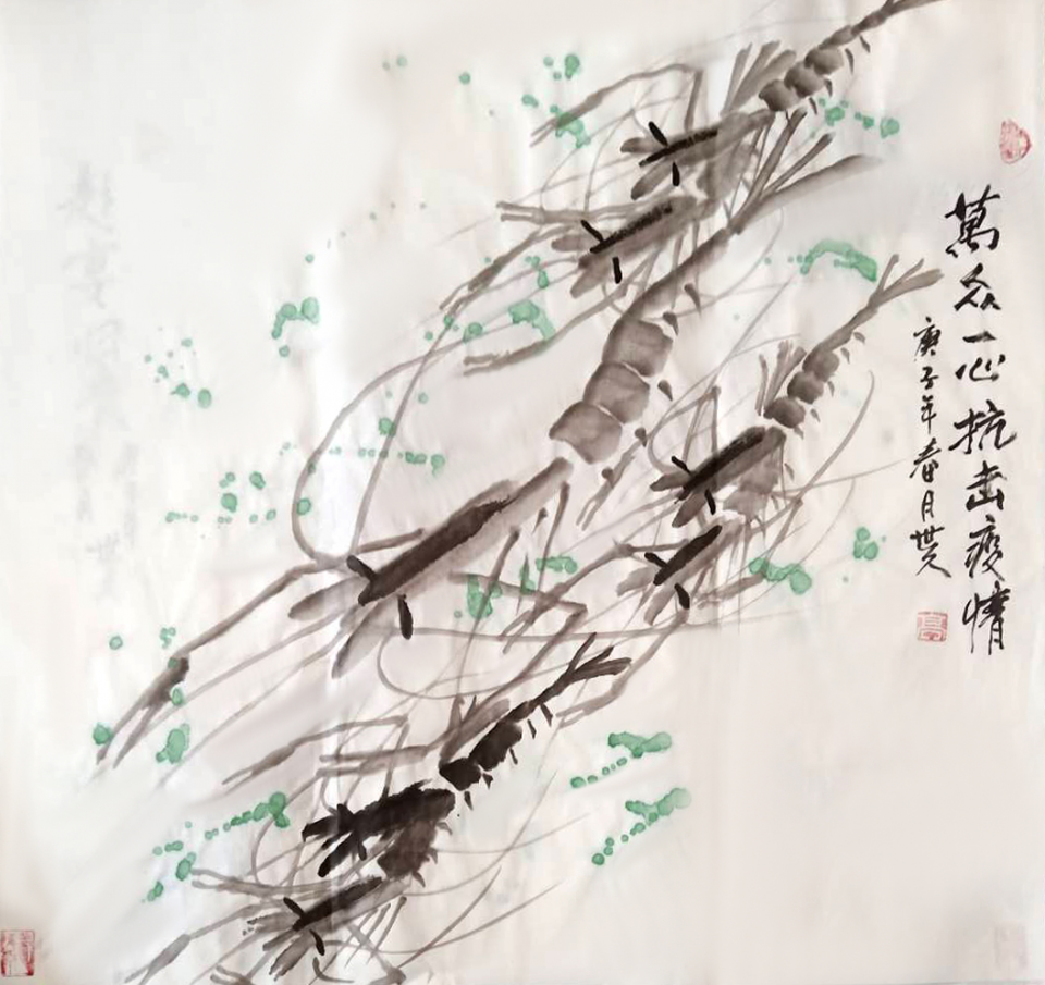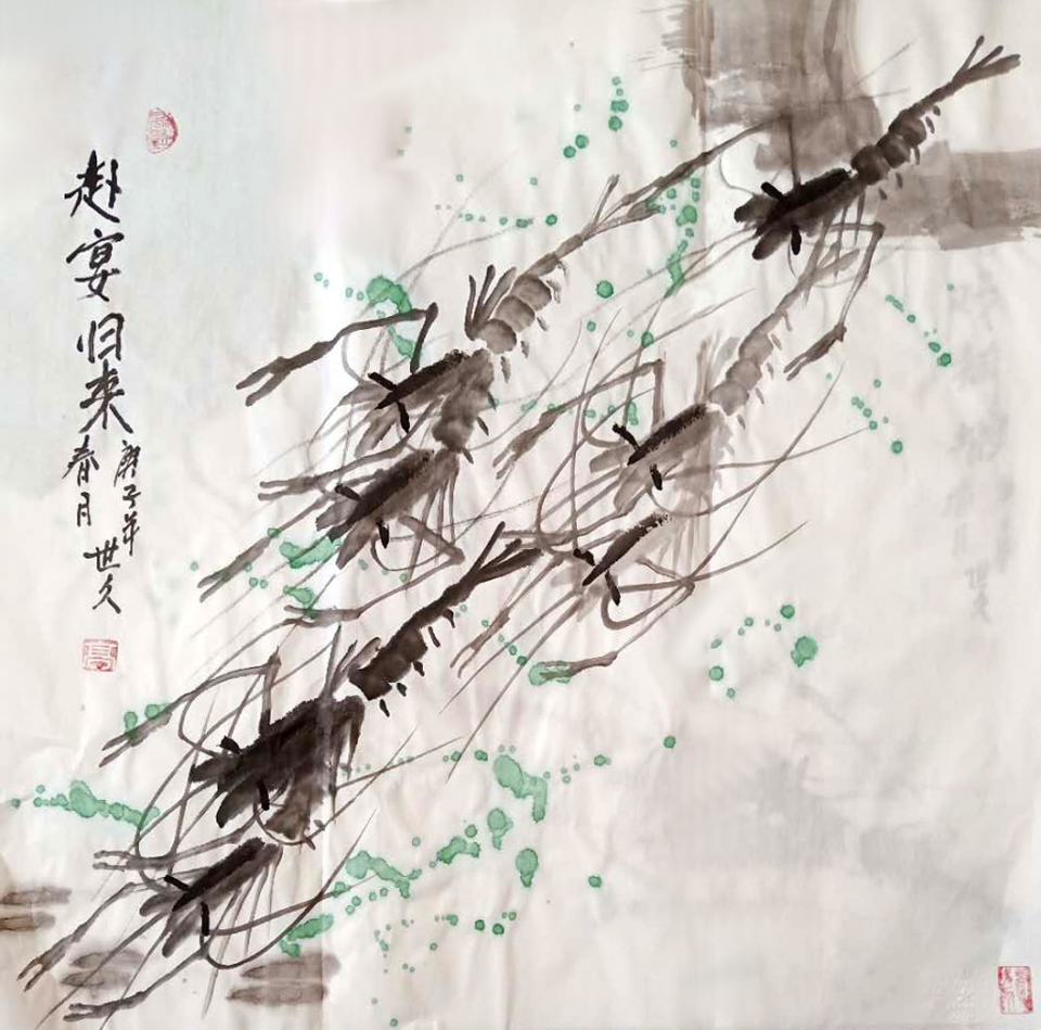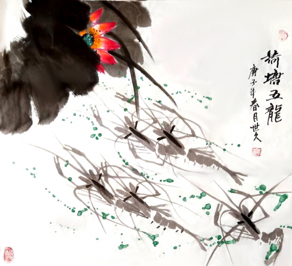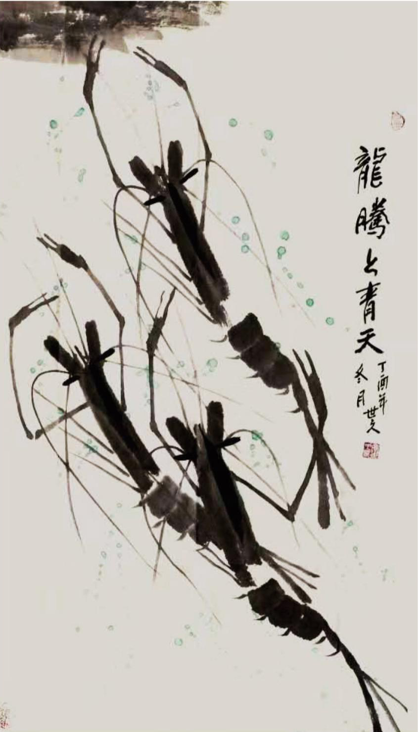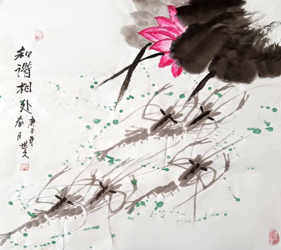 他的虾画与泼墨荷画同作一题,有骨画法与没骨画法相依相映,把虾的灵与荷的禅融为一体,虚实相生,动静烘托,不但有赏心悦目的观赏性,也有雅饰厅堂的文化装点效果,有这样一幅荷池龙虾挂在雅舍,可以让空间的文化品位立增数倍!久观耐品,文人画的文化气韵,总是扑面盈心,令人过目不忘记,蓬荜生辉,修身益心!这就是先生的画在专业圈大众审美圈口碑皆显不俗的重要原因。他的画可饰万家屏障,自是文化弘扬的立世功勋!