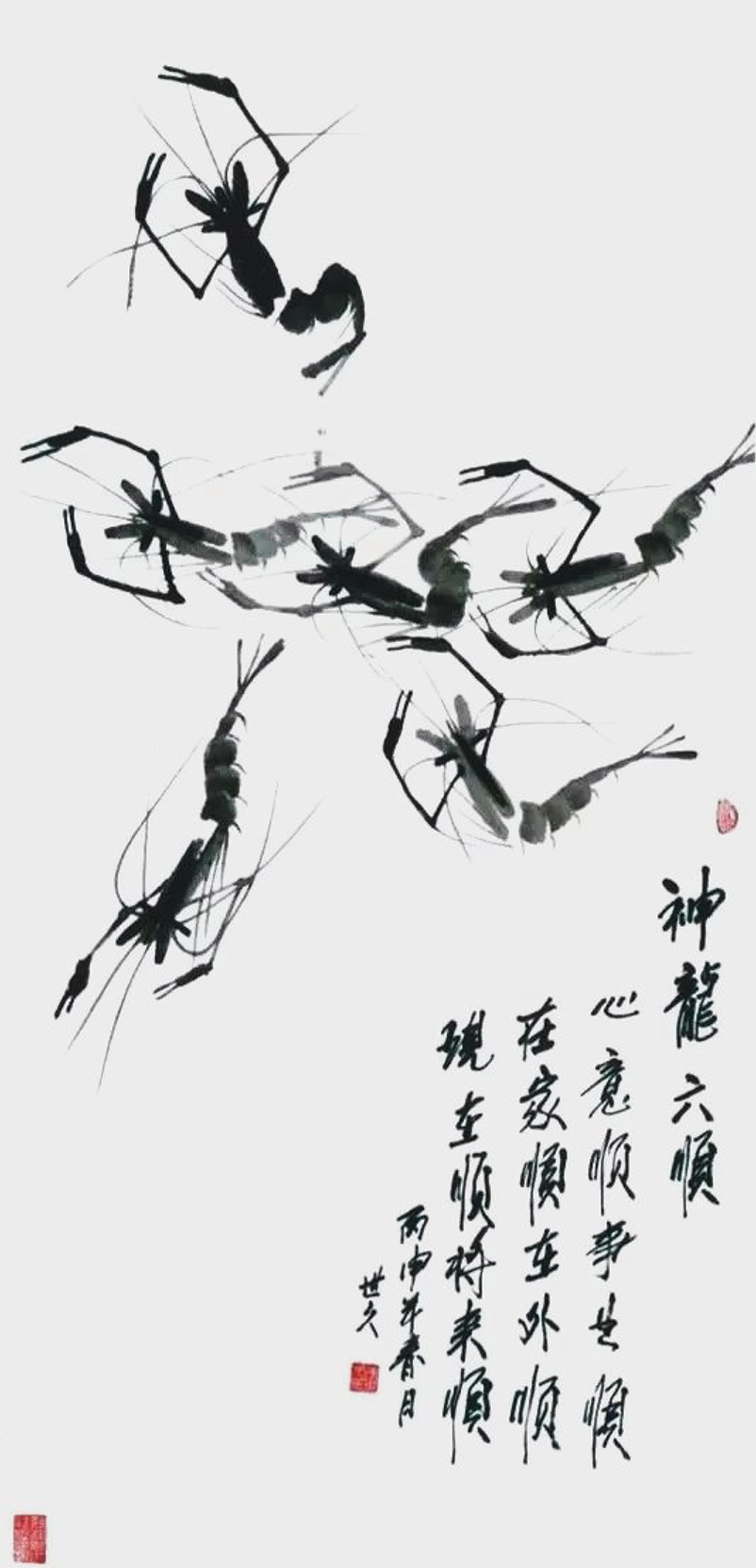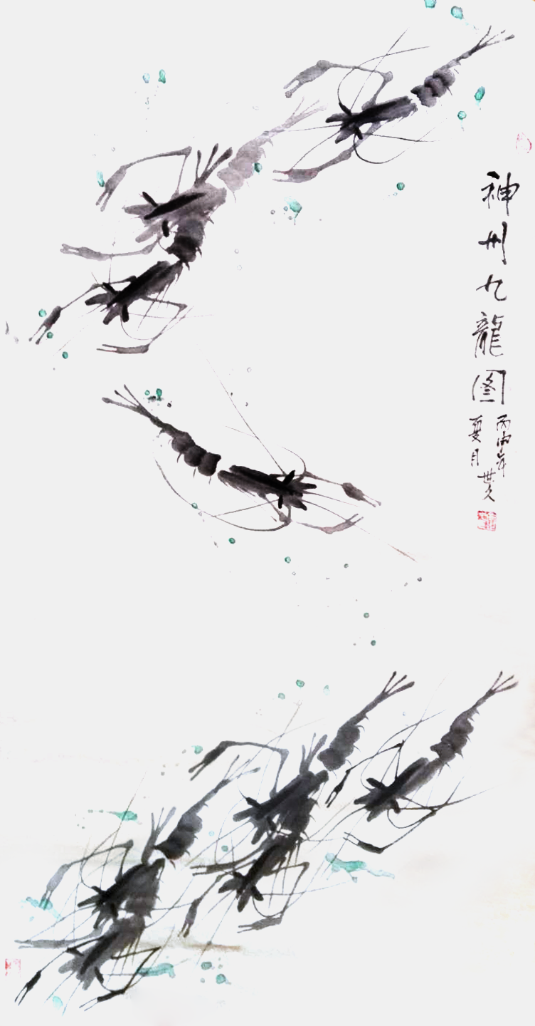 再以锋纤往来画须、画爪,骨法用笔的特征非常明显,落笔钧直,起笔痛快,焦墨写意,从来不显粗糙现象,细处里收拾得相当妥当!梳理一下画史,自古至今,除先生之外没有一人用铁笔焦墨画过虾题!所以先生之画虾,借古开今,与白石的虾画相比,不缺趣味灵性,更是多了一份铁笔龙虾铸精神的格局。小虾题大格局,时代风范融丹青,九龙图寓神州盛!