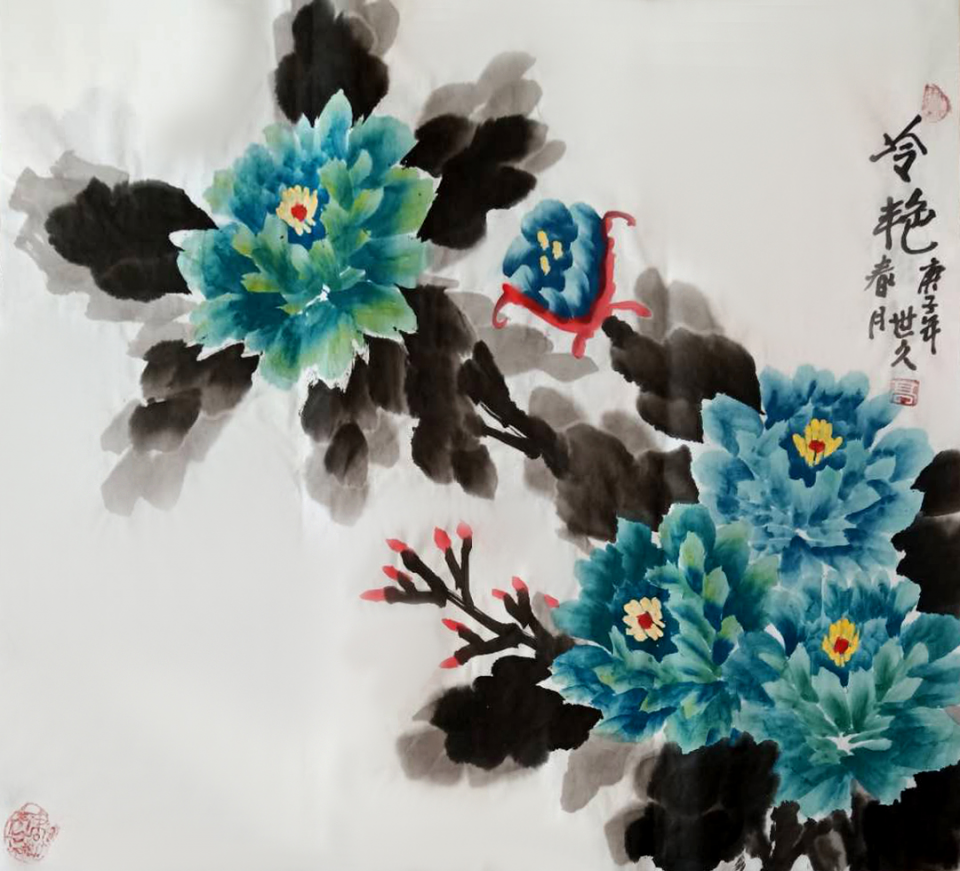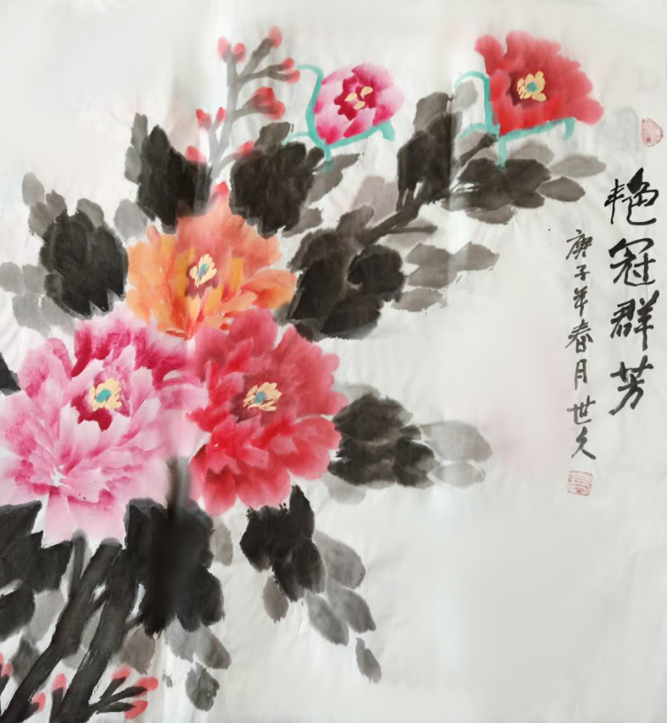 古今永传绘丹青,独树一帜开新篇。高先生画牡丹也有浓墨重彩绘华章的文人大格局,水墨五彩焕神,胭脂艳而不俗,花头层次分明,枝叶也见钢打铁铸。牡丹常见一枝望云天的空间图式,花寓龙腾,艳而不俗,丰姿多神,华夏昌盛!用画咏中华,先生最谙此道,所以独家塑造,贵在主旨高格!凡属大家,尽是这般丹青写高远的风范!