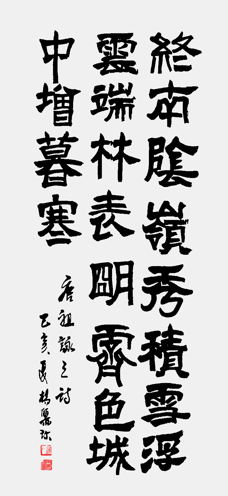 杨女士的隶书深师曹全碑和礼器碑,把这两块碑典雅秀拔的风格表现的一览无余。人常言楷不练欧,隶不练曹。不是不能练,而是曹全碑严谨细腻的笔法入门难,得法亦难,写出复碑体貌的成绩更难。所以隶不练曹是“绕开”之意多一点,非书性超人而不能得之法。杨女士练曹全碑,化难为易的法门,就在于法由师授的便利。经由名家传习,口传手授,她可以近水楼台先得月,向阳花木易作春!把曹全碑的难度逐渐解锁,写出秀而雅,亦不失精气神的真谛。再加上礼器碑的筋骨加持,让她的隶书在精气神的表现空间里,又多一份正大气象,法涉两碑,也是得益于可以融会贯通的非凡书性。