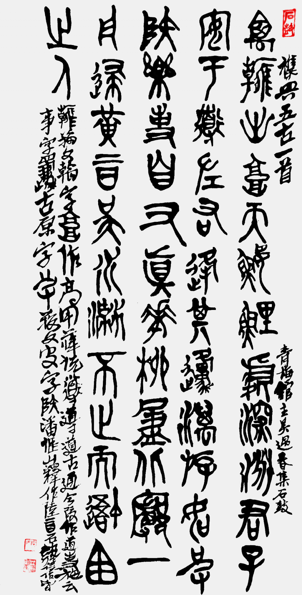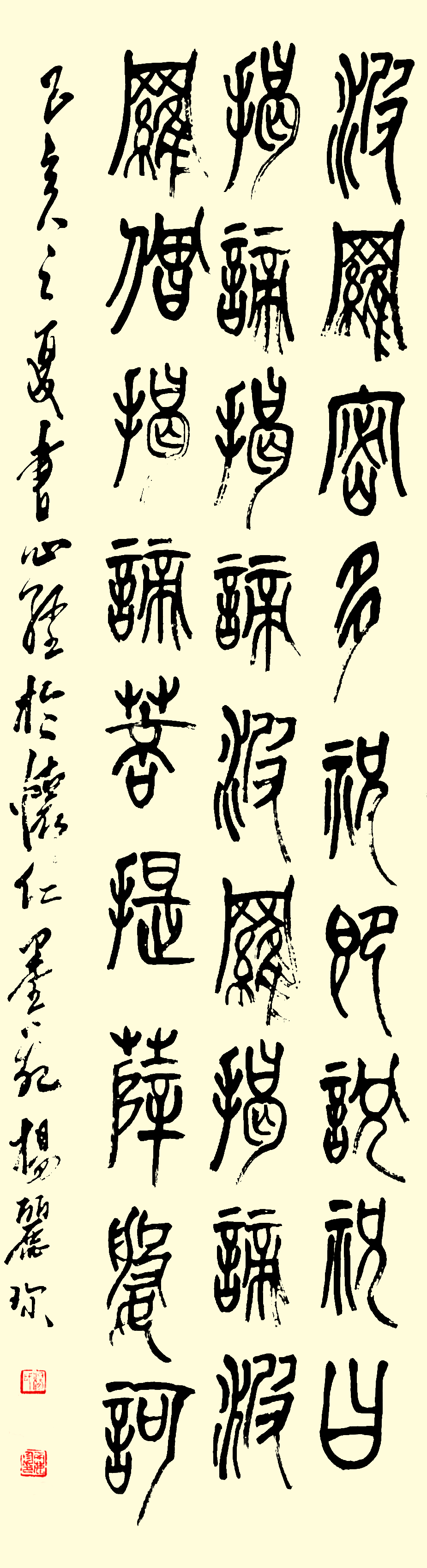 她对篆书一体进行了精研潭思。篆书为诸书之源本,如无琢磨,写其他书法就有先天失本的尴尬。杨女士穷研篆籀,功省且易成,写得一手风规高古的好篆书。她的篆书兼取大篆的饱满圆厚和小篆的飞仪多姿,从石鼓文里参意笔法,从泰山碑里寻觅庄严,融会贯通,把篆书写出了雅俗共赏的新体貌。特别是在结体取势上,改变了篆书的对称方整,中轴线自右上至左下稍倾,重心调整的智慧,可以让篆书表现出生动活泼的书写性,让人看得赏心悦目。
