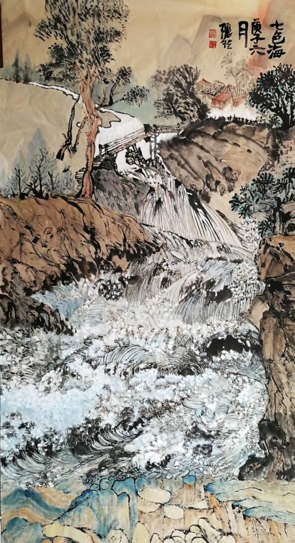 博涉碑帖,书性超群。杨女士书法写得好,丹青也见妙作。用精湛细腻的笔墨画山水,以笔立骨,色墨显神,淡赋青绿绘雅质,色不碍墨,墨不碍色,写画如诗:一天清淑气,万里碧榆风。有诗词入画的内涵,也有以书入画的表现,笔墨正宗,气韵生动。所以她可以通谙书画同源的机理,成为书画艺术的贤家!