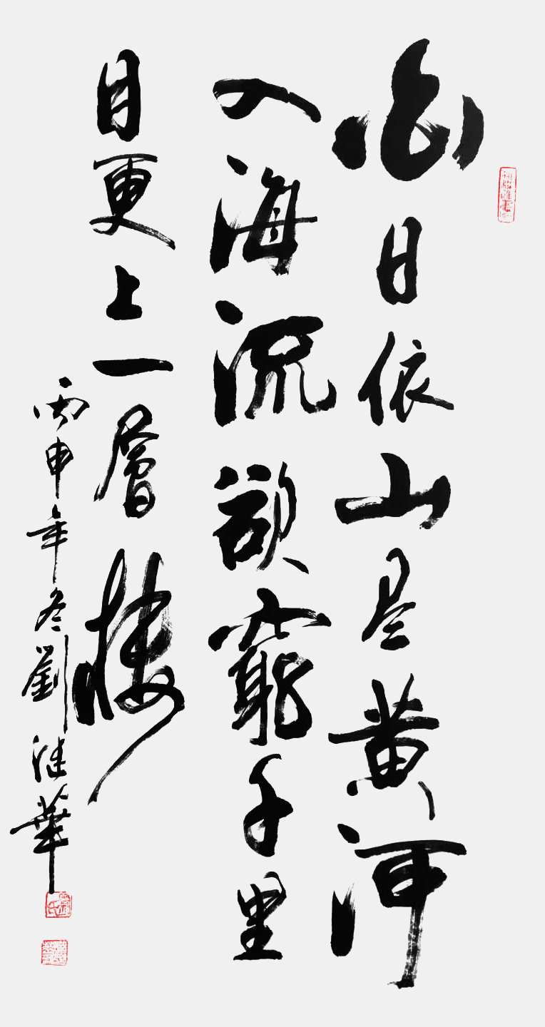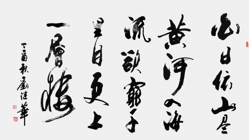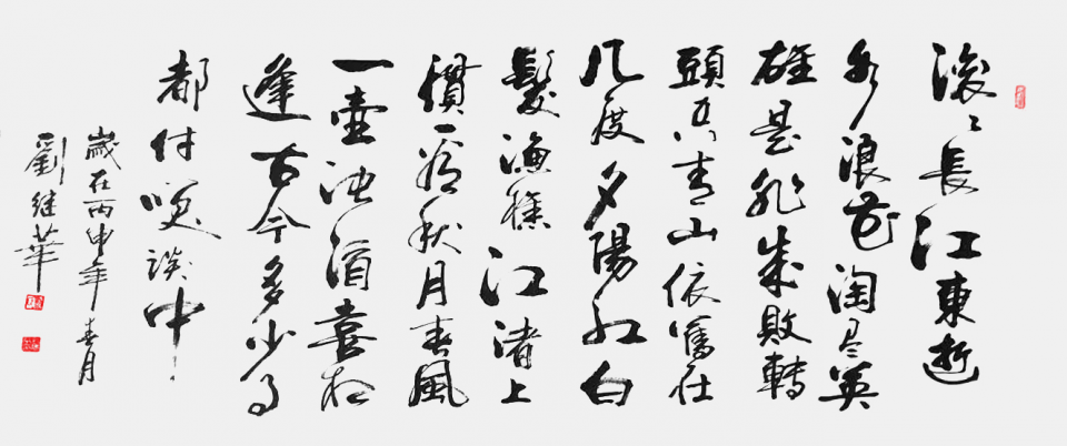 其书法要妙之二,在于引碑入行草的探索。碑与帖几乎隐藏着所有的书法机密,但是碑是碑,帖是帖的旧习,很难让碑之骨力与帖之气韵融融在一起。刘继华先生有研究龙门二十品的积淀,再有心观自叙帖的智慧,所以就有了引碑入行草的胆识!胆自修养来,识自博学来,他数十年的书道进阶,就是一条碑帖同修的正大路径,引碑入行草并非异想天开,而是水到渠道成的自然!他的行草作品里,尽可以有碑质立骨的劲感,写得飘风骤雨惊竦竦,也有帖源气韵的美感,写得落花飞雪何茫茫!碑是碑,帖是帖的书法壁垒,由此打通,成为刘继华先生书法传承与创新双有造诣的见证!