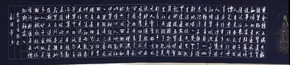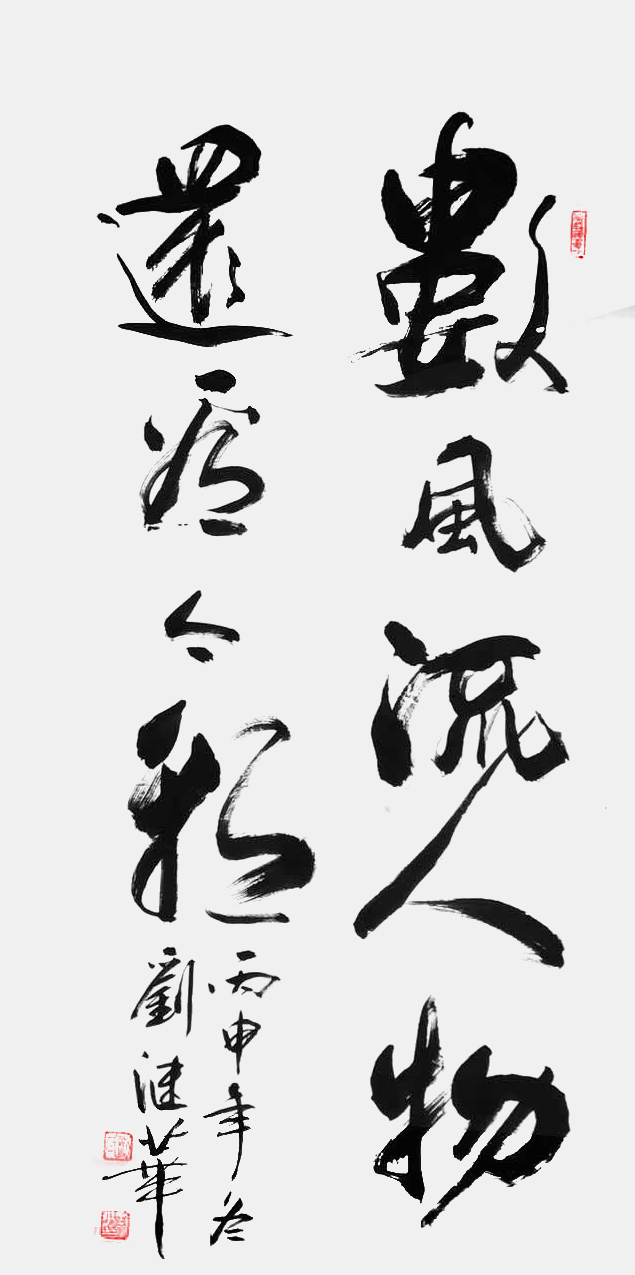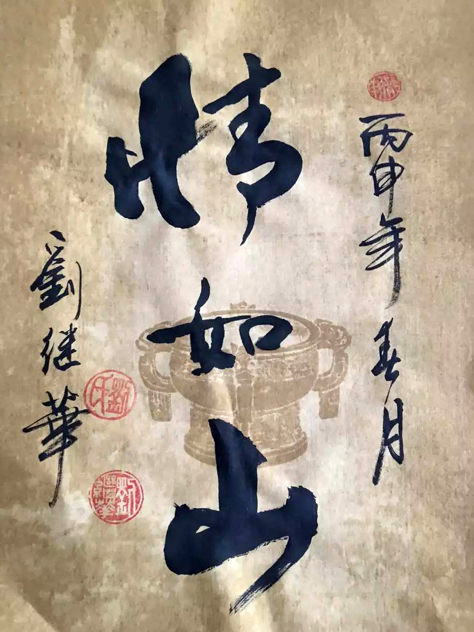 其书法要妙之三,在于结体与章法的天质自然。论结体,故意而为之是呆板,不自然。论章法,刻意而谋策是僵化,不自如。刘继华先生的书法结体,意在笔先,写得凌空杀纸,恰如秋鹰逐逸,张驰全凭自然,所以字内点划穿插非呆板,细节处理得相当完美,常见一点斜附,如螳螂抱枝的生动,也有点划连掇,绝而不离的意象。其书法的章法也是贵在疏密自然,大字蹙之贵小,小字释之贵大,宽狭相宜,自然而成!变化是悦目,自然谓赏心,有以上三者之妙,让刘继华的书法可以在锋纤往来之际统摄人心,笔墨播文化,功德自然成!