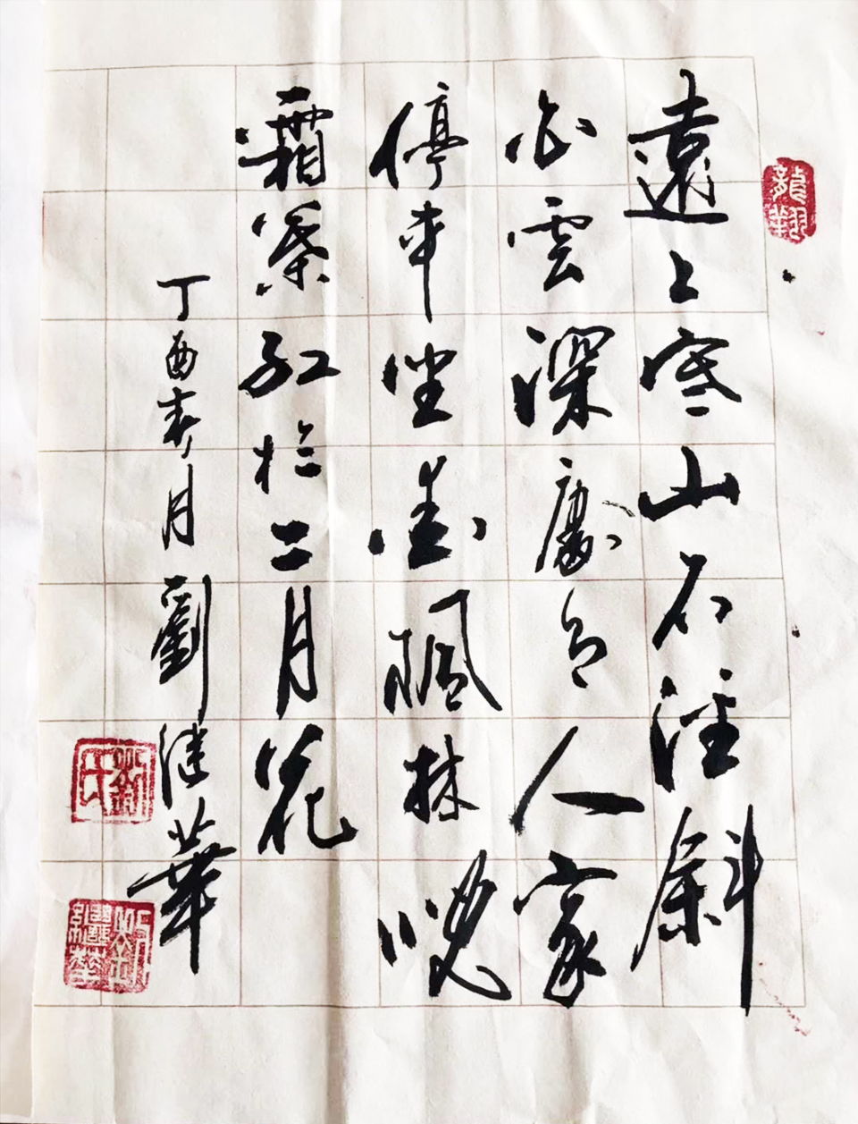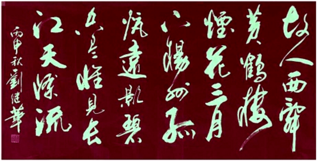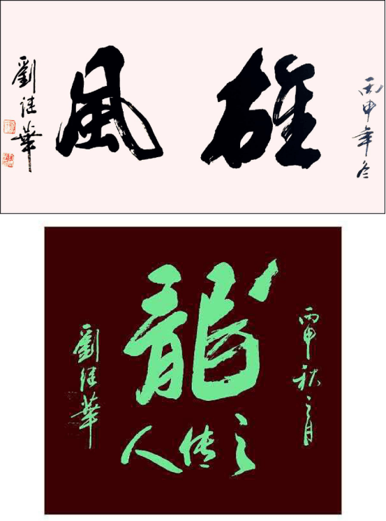 刘继华,安徽省龙翔药品销售有限公司总经理,安徽省优秀民营企业家、安徽徽商名人、中国书画艺术研究院理事、中国书画家协会会员、中国老年书画研究会会员、上海海上书画研究院副院长、上海海上书画研究院高塘分院院长、中国硬笔书法家协会毫州市分会副主席、临泉县老年书画研究会高塘分会会长、该同志法帖王羲之,圣教序,兰亭序。龙门二十品,米芾怀素和羲之帖,槐树自述帖,艰苦用功四十余年,融数家之长汇为一体。上海书画名人杨华耀院长赞曰:纵笔豪放、奇态横发、神融笔畅、灵动秀雅、章法有条、疏密得体……作品受到广大书画爱好者赞同、收藏。