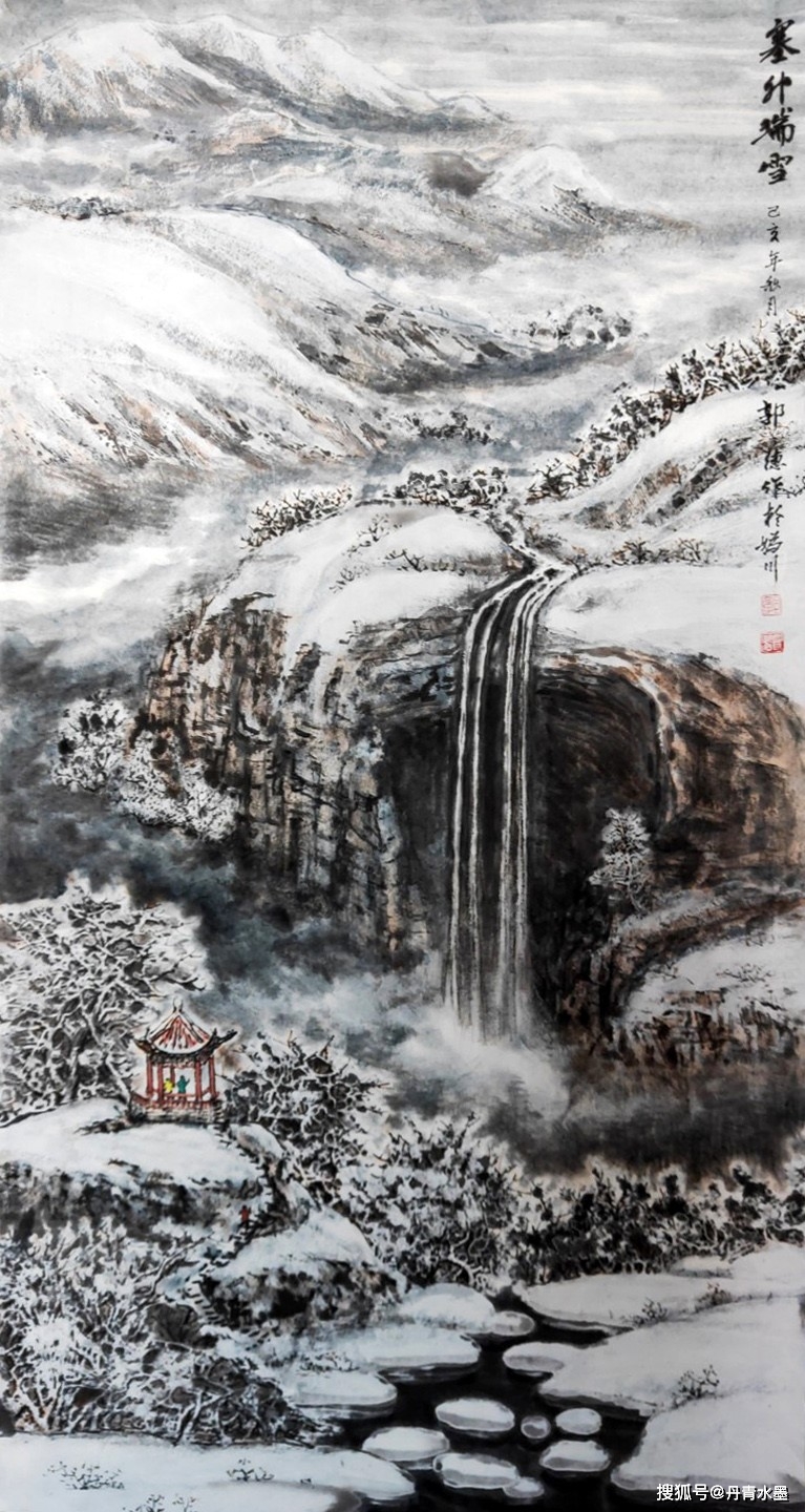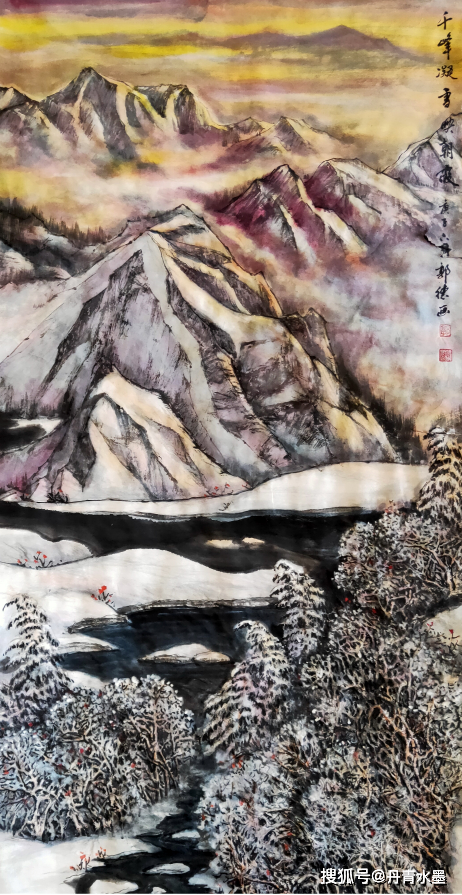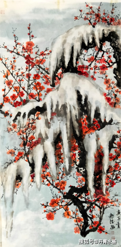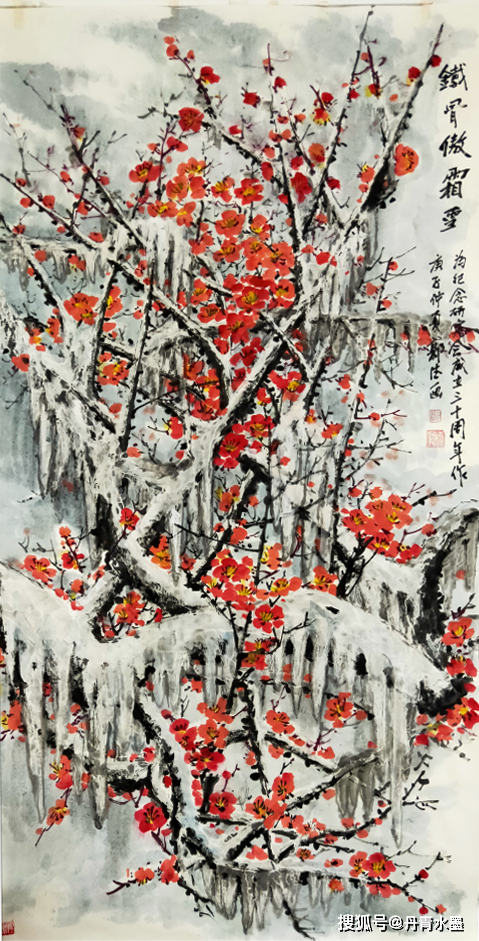 浑厚华滋,气韵生动。除了画山水极见笔墨功夫,郭德先生又独有画凌冰梅花的自家领地。梅雪争春非神奇,红梅挂冰是奇观!他的用独特的技法表现冰的质感,在宣纸上做冰心玉壶,亘古未见。以虚写实,实则又虚。冰肌映红梅,生成强烈的视觉对比,也是和谐的意象景观,为中国画添加了新的语言方式,也为梅花一题带来与众不同的表现形式!唯有大手笔,才可以遂心应手,创作冰梅新奇!