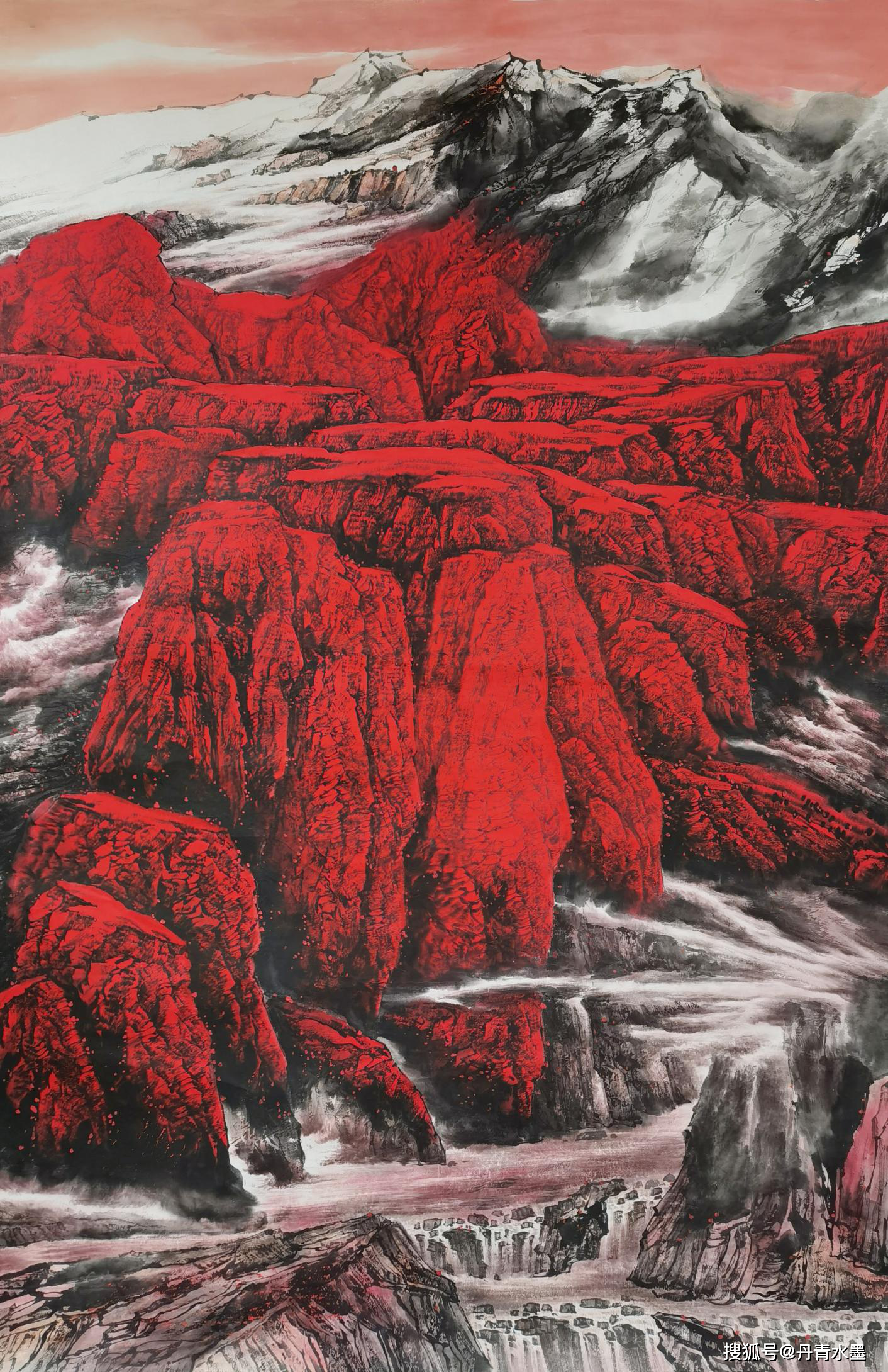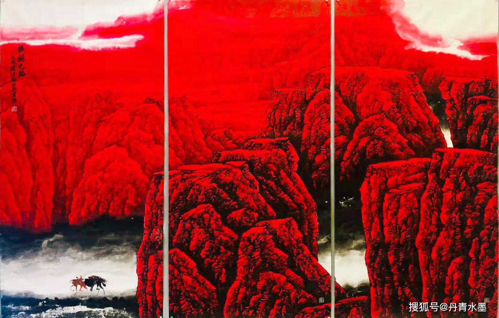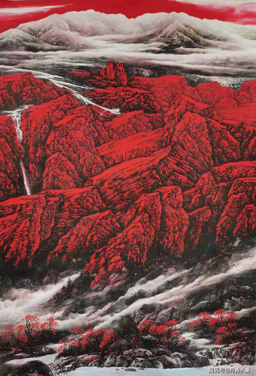 高劲松的红墨山水气象磅礴,在质感伟岸的同时,又倾向于诗意的表达,浪漫主义的格调扑面盈心!画风与别人并不雷同,非常认可“可贵者胆,所要者魂”“用最大的功力大进去,用最大的勇气打出来”的创作思维,所以因心转境,用红墨作铺陈,让古老的山水画艺术获得了可映时代精神的新的生命!