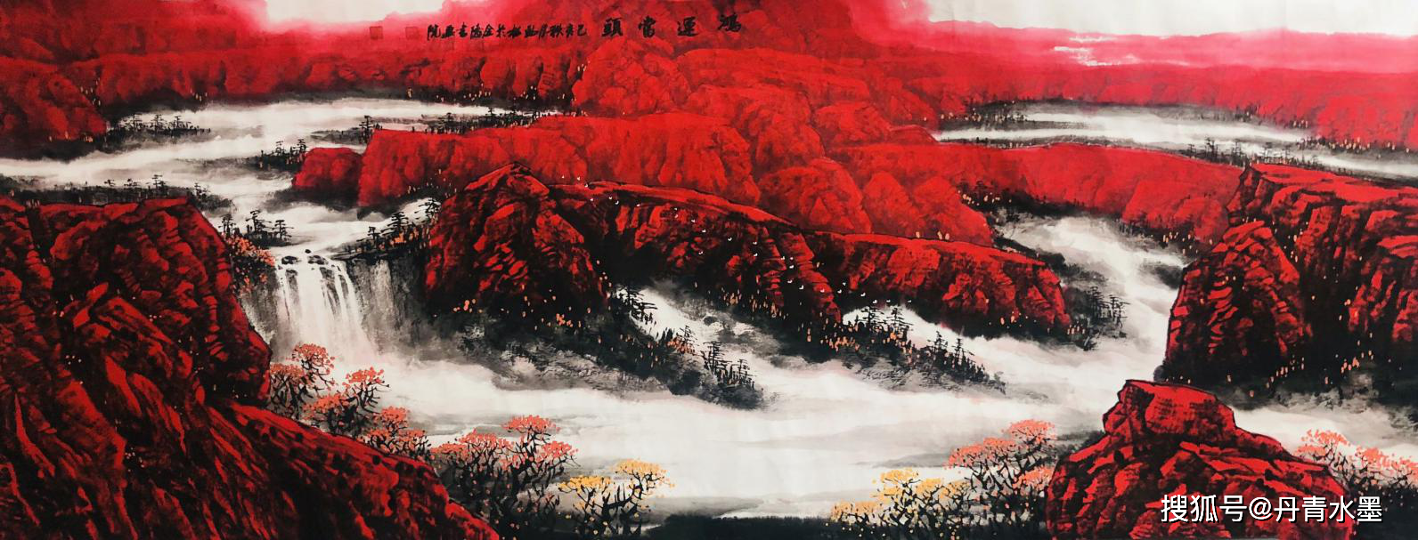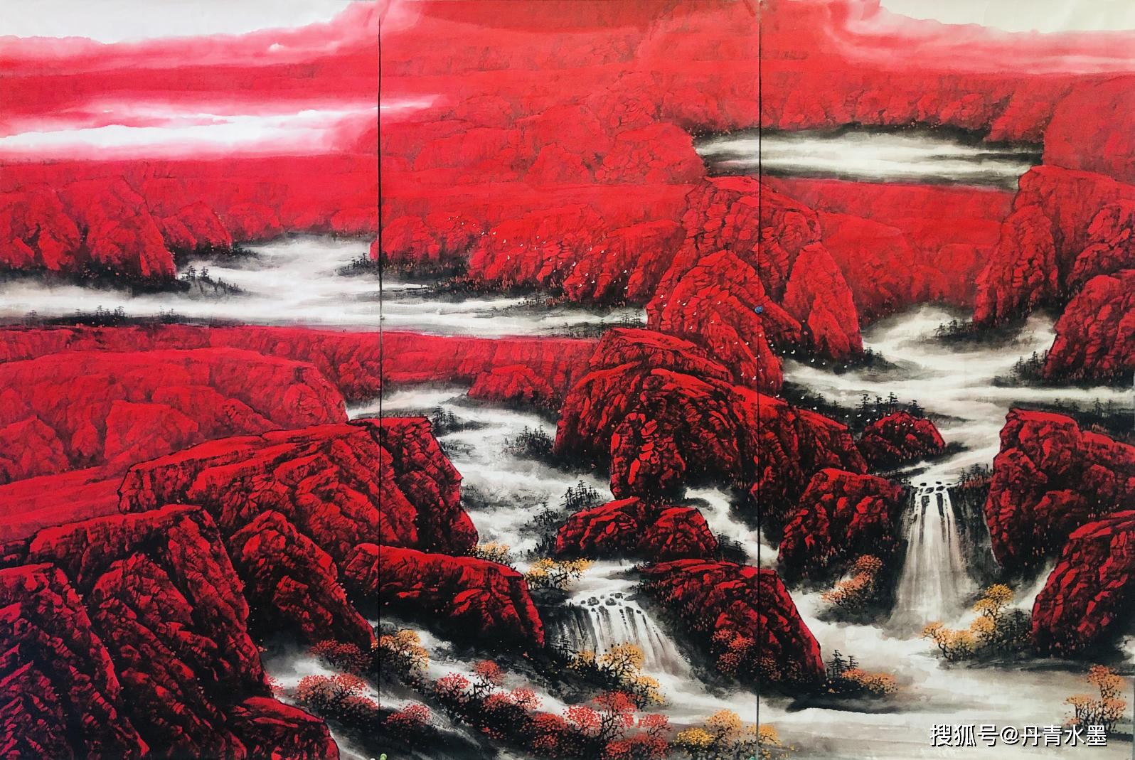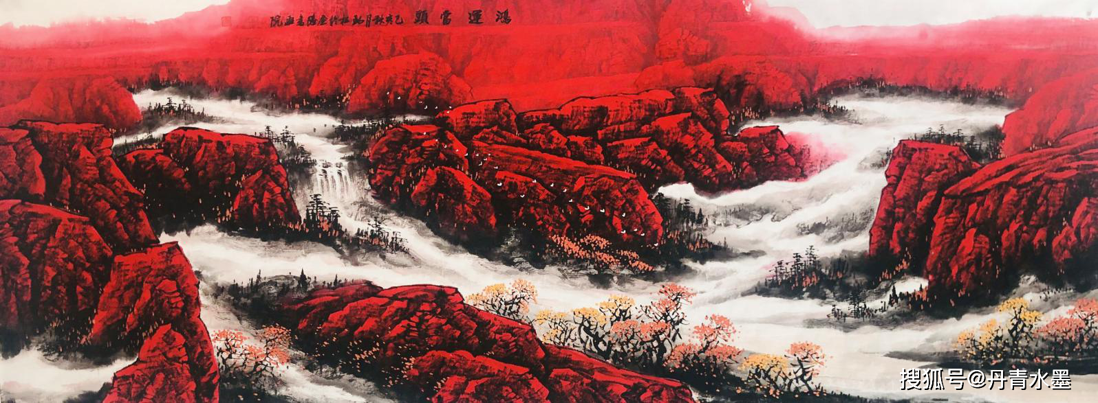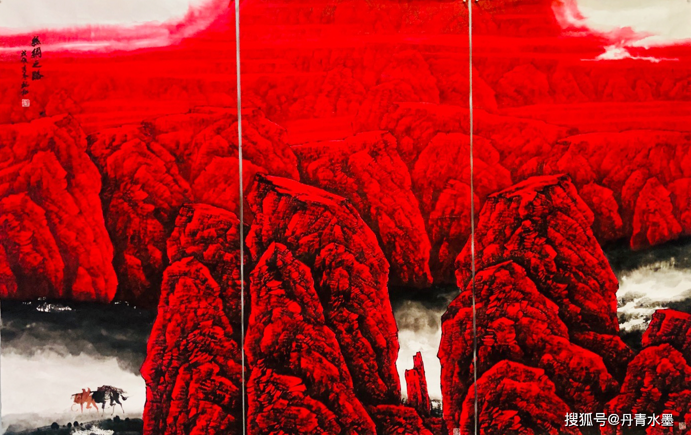 高劲松的红墨山水气象磅礴,在质感伟岸的同时,又倾向于诗意的表达,浪漫主义的格调扑面盈心!画风与别人并不雷同,非常认可“可贵者胆,所要者魂”“用最大的功力大进去,用最大的勇气打出来”的创作思维,所以因心转境,用红墨作铺陈,让古老的山水画艺术获得了可映时代精神的新的生命!